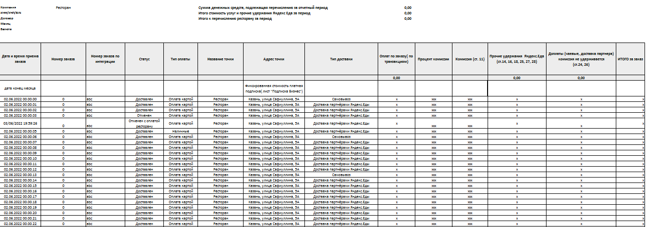 Содержит общую стоимость услуг Yandex Eats за период с первого по последнее число отчетного месяца. Приложение к акту содержит информацию о деньгах, которые мы получили от пользователей или компенсировали ресторану за свой счет. А также о фактически удержанных за отчетный период средствах — вознаграждении за услуги сервиса или удержаниях за заказы с ошибками на стороне ресторана.