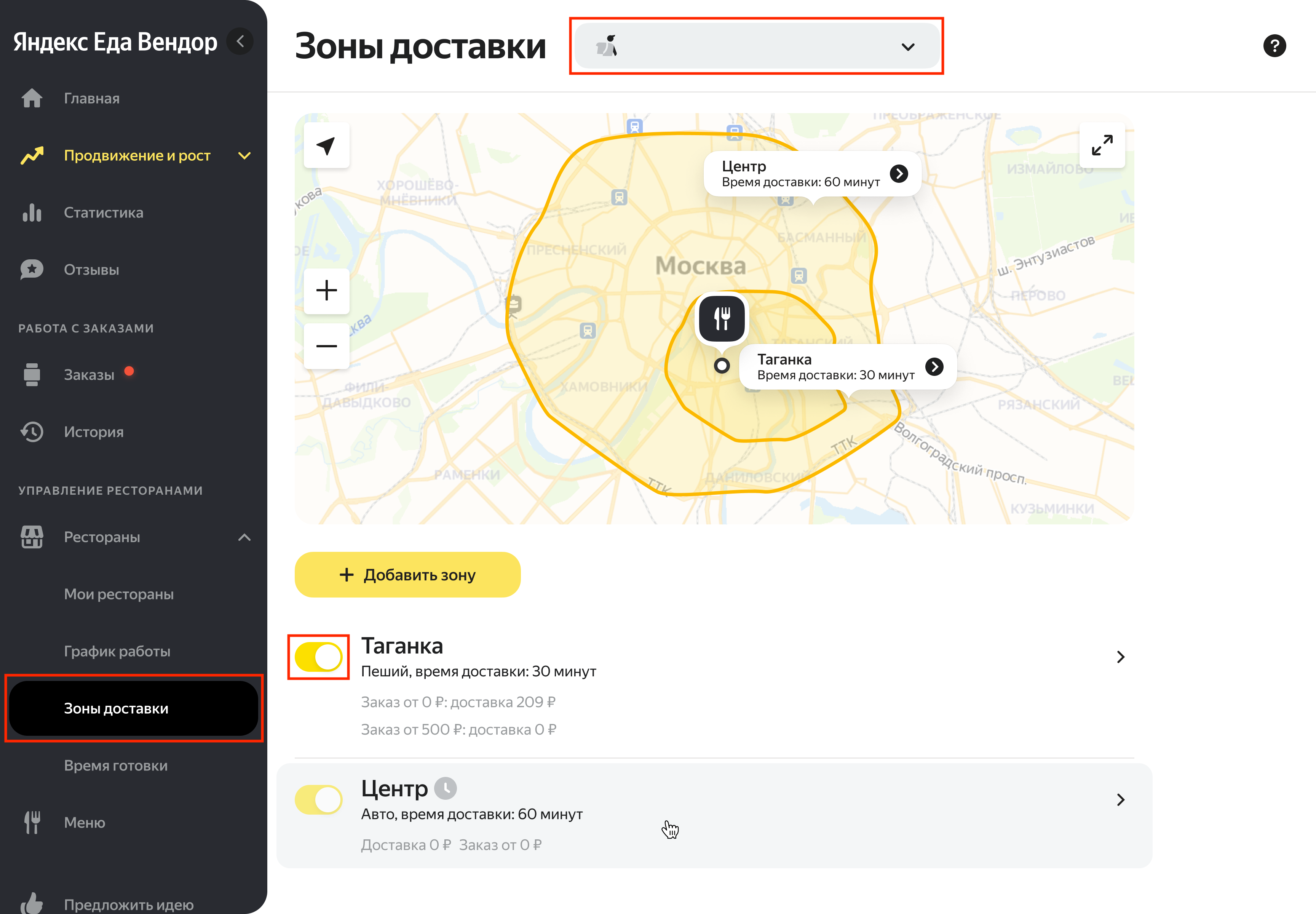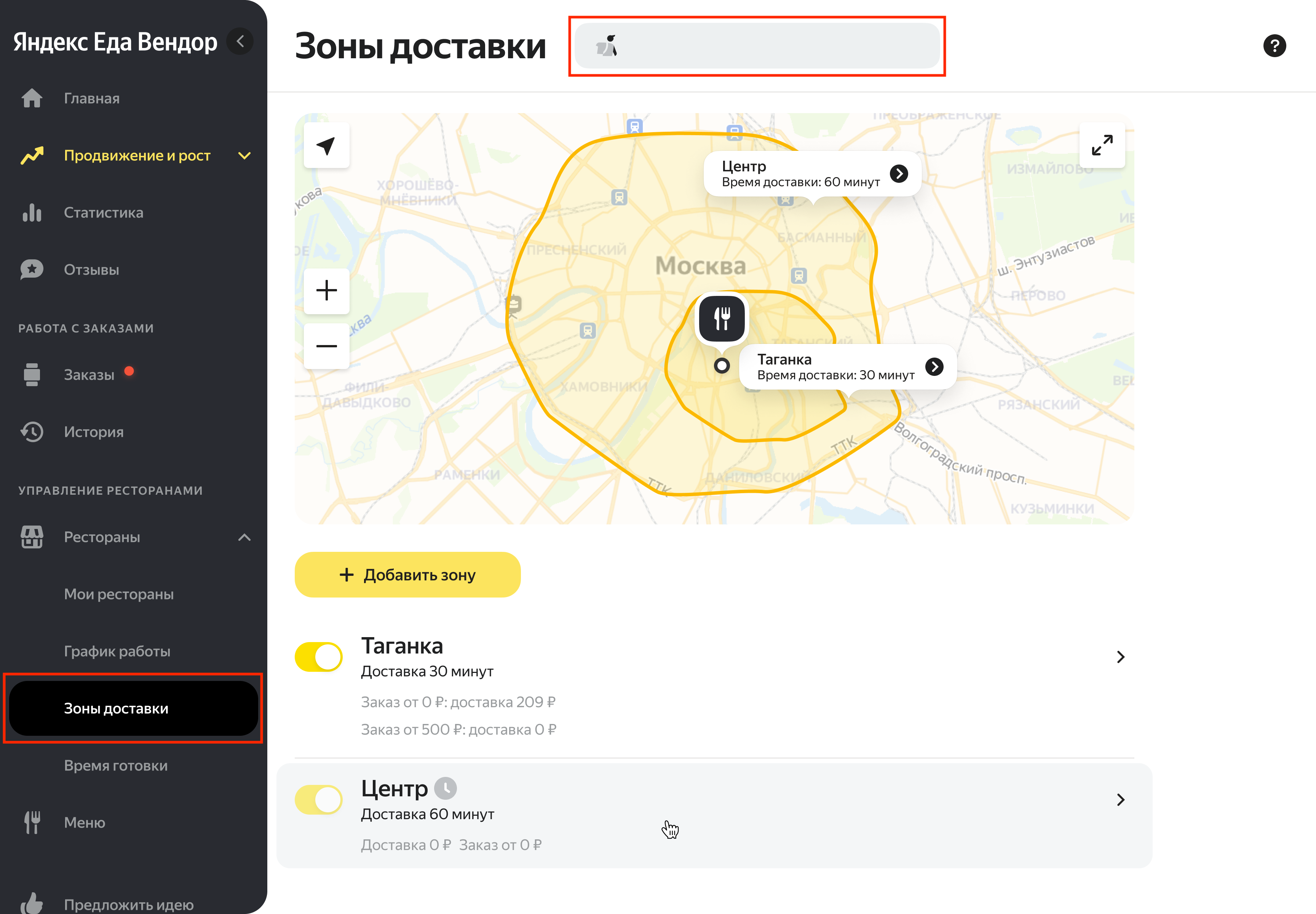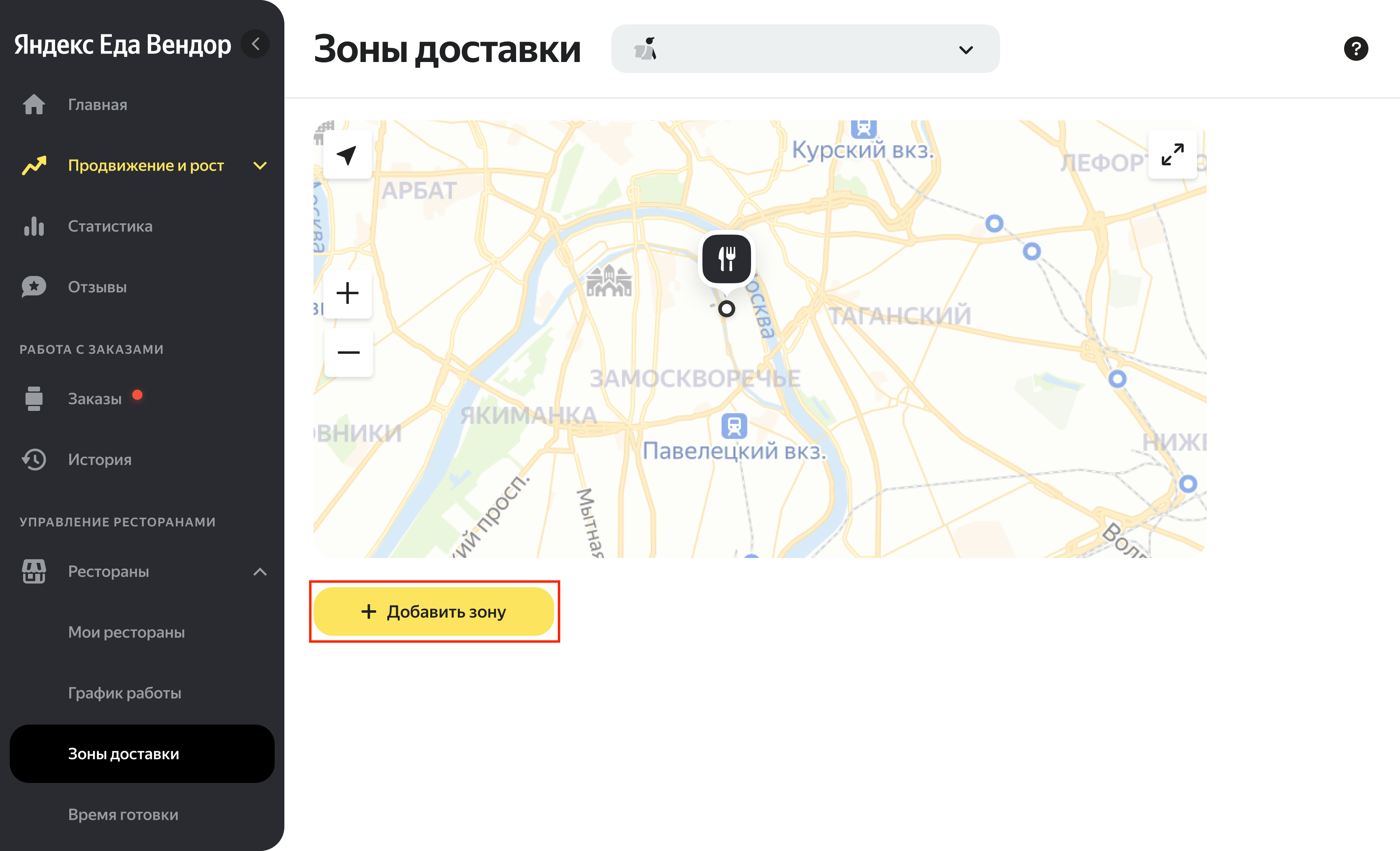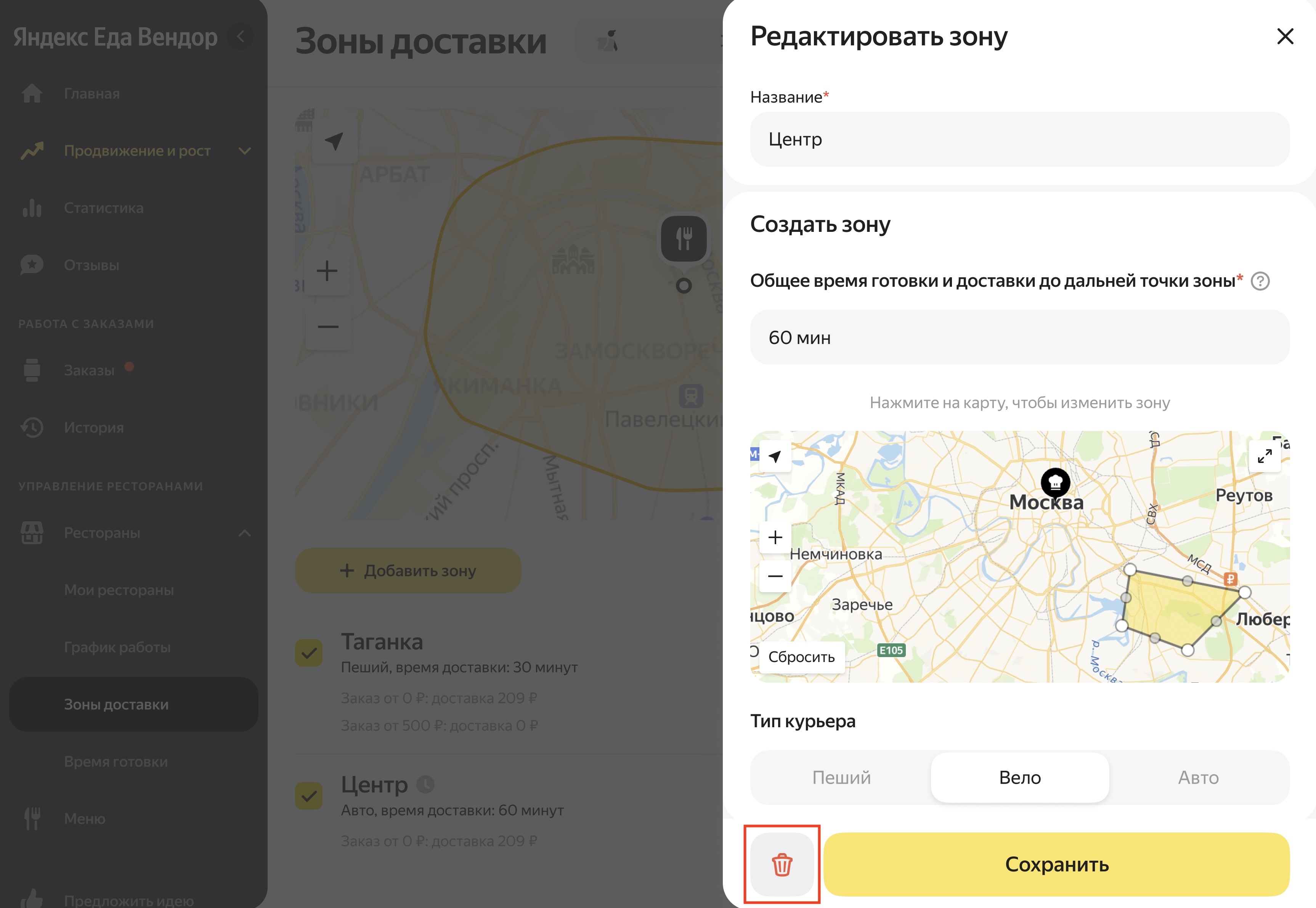 Зоны доставки курьерами ресторана можно добавлять и редактировать самостоятельно.