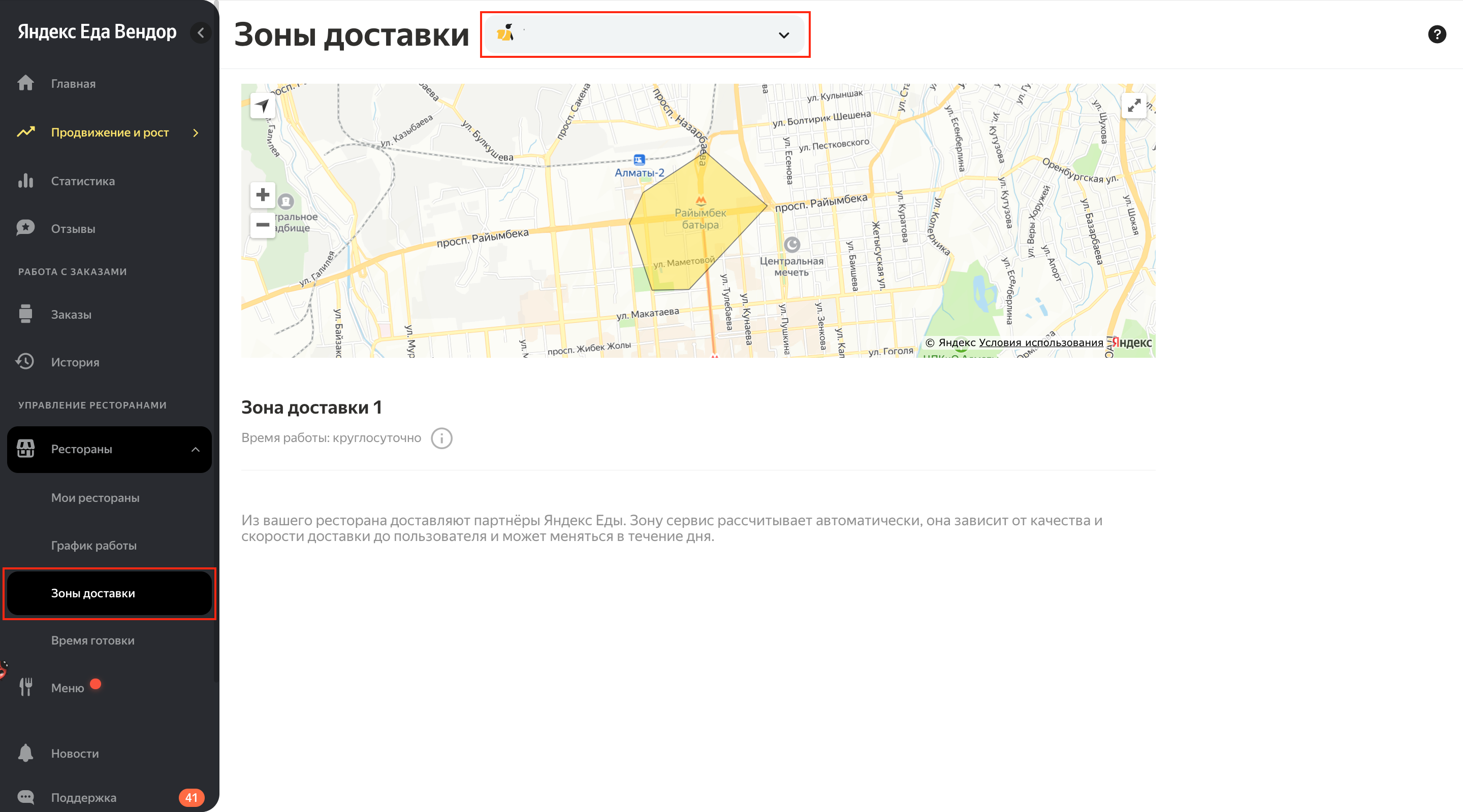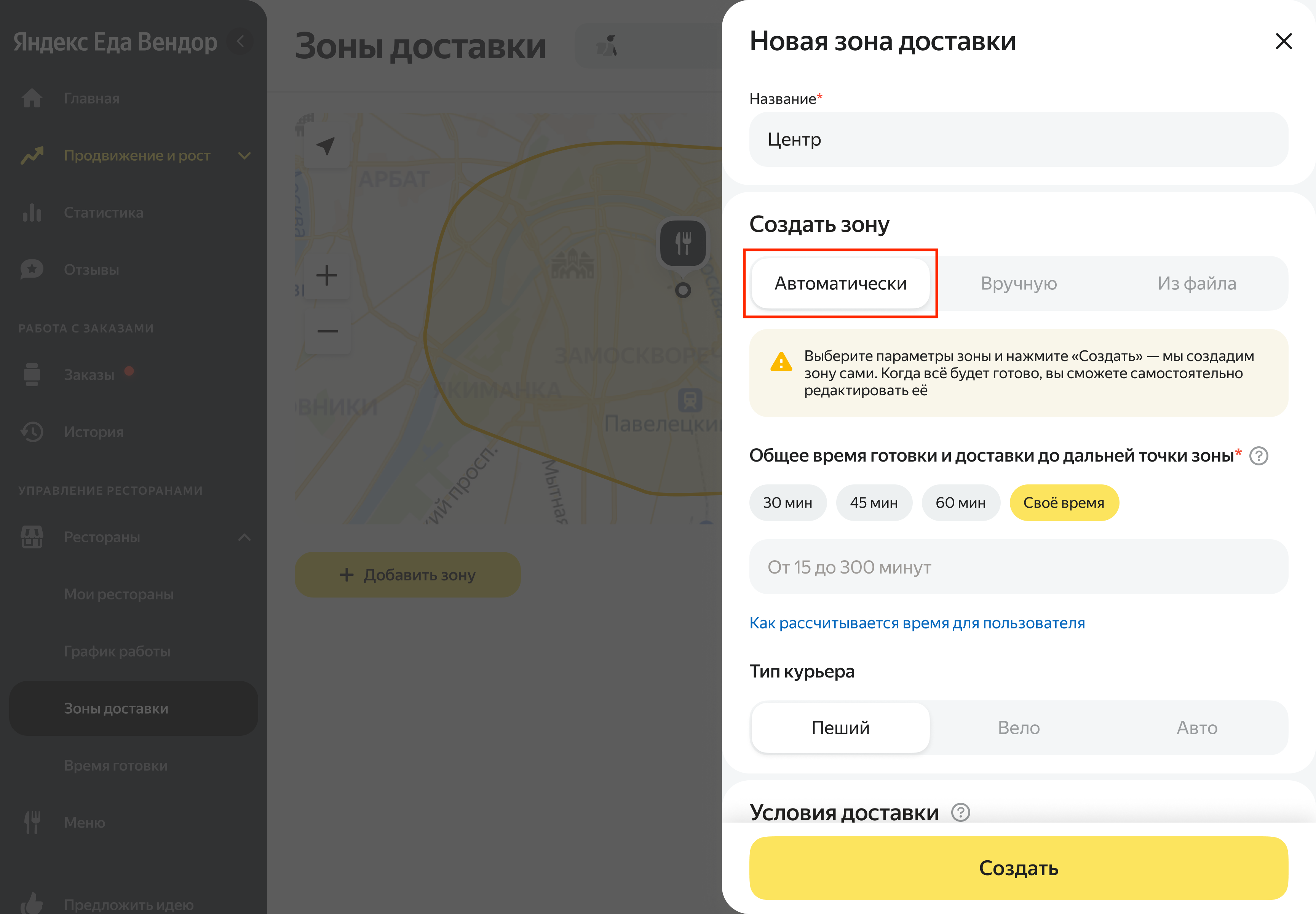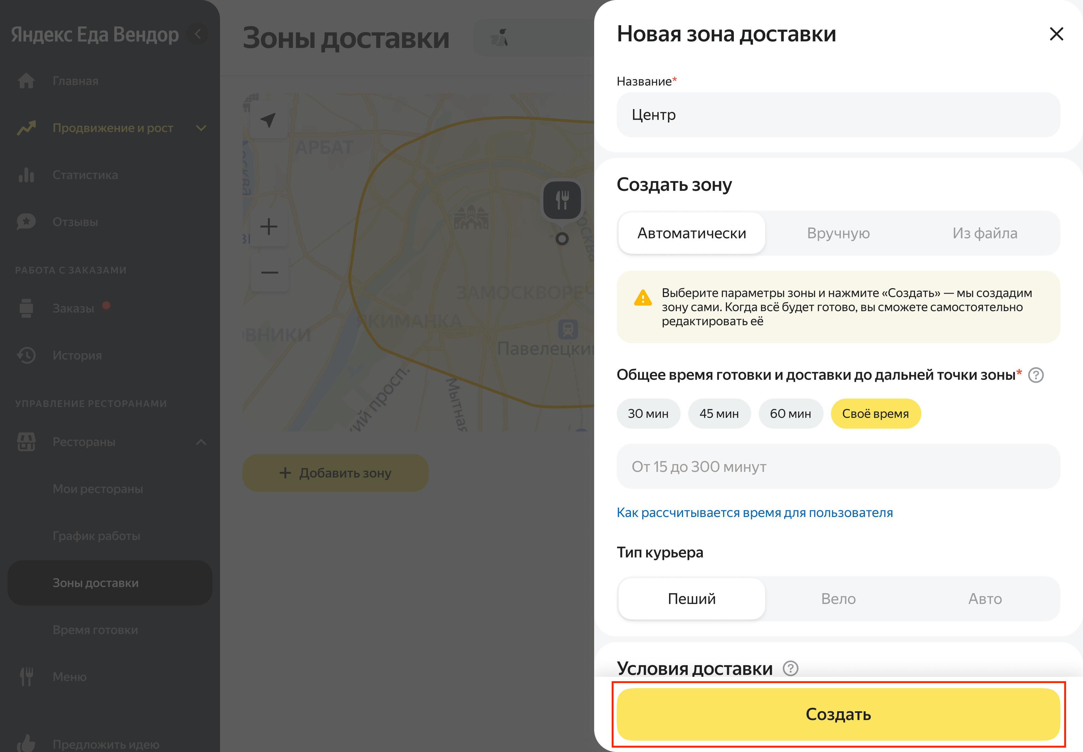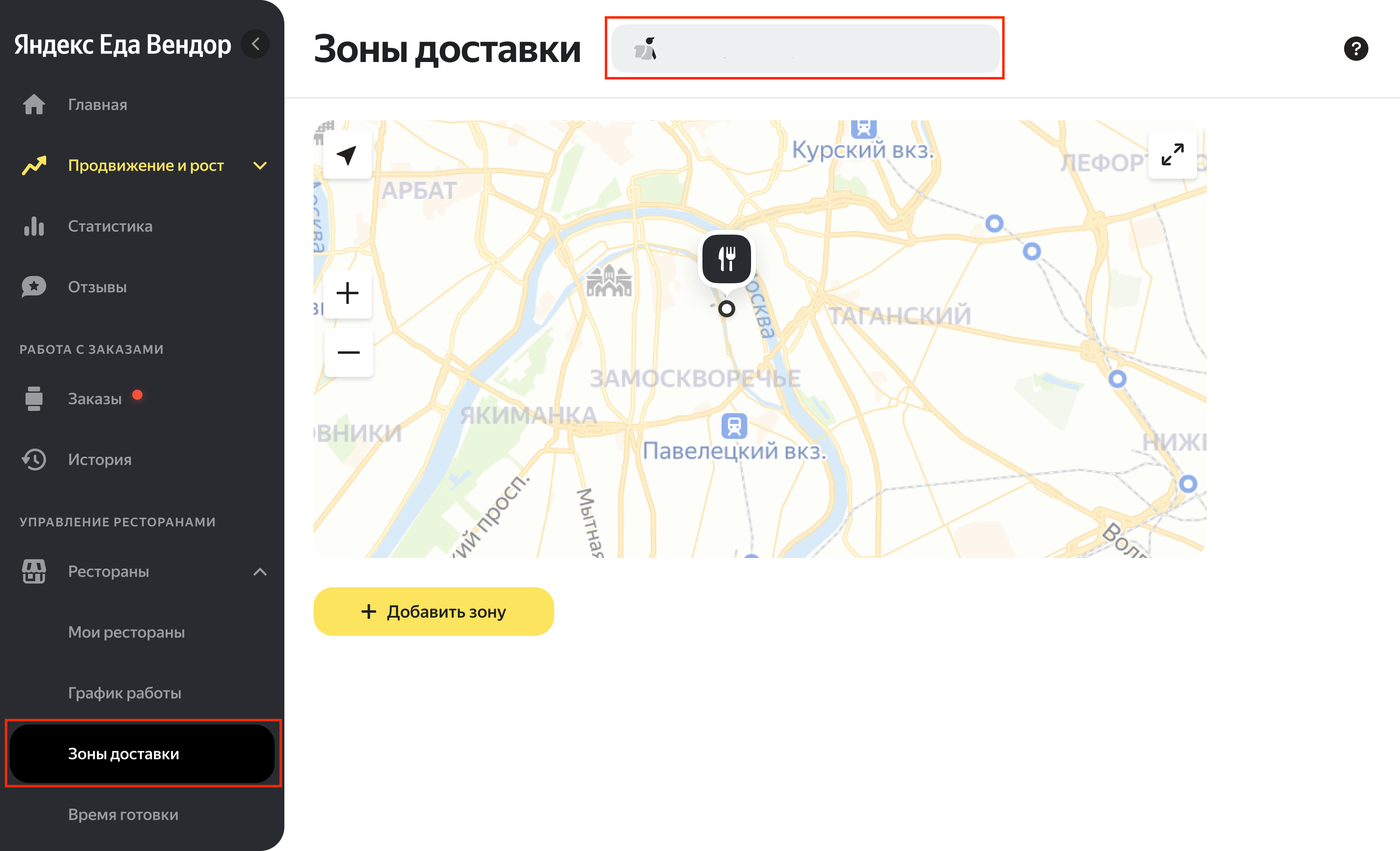 Зоны доставки курьерами ресторана можно добавлять и редактировать самостоятельно.
