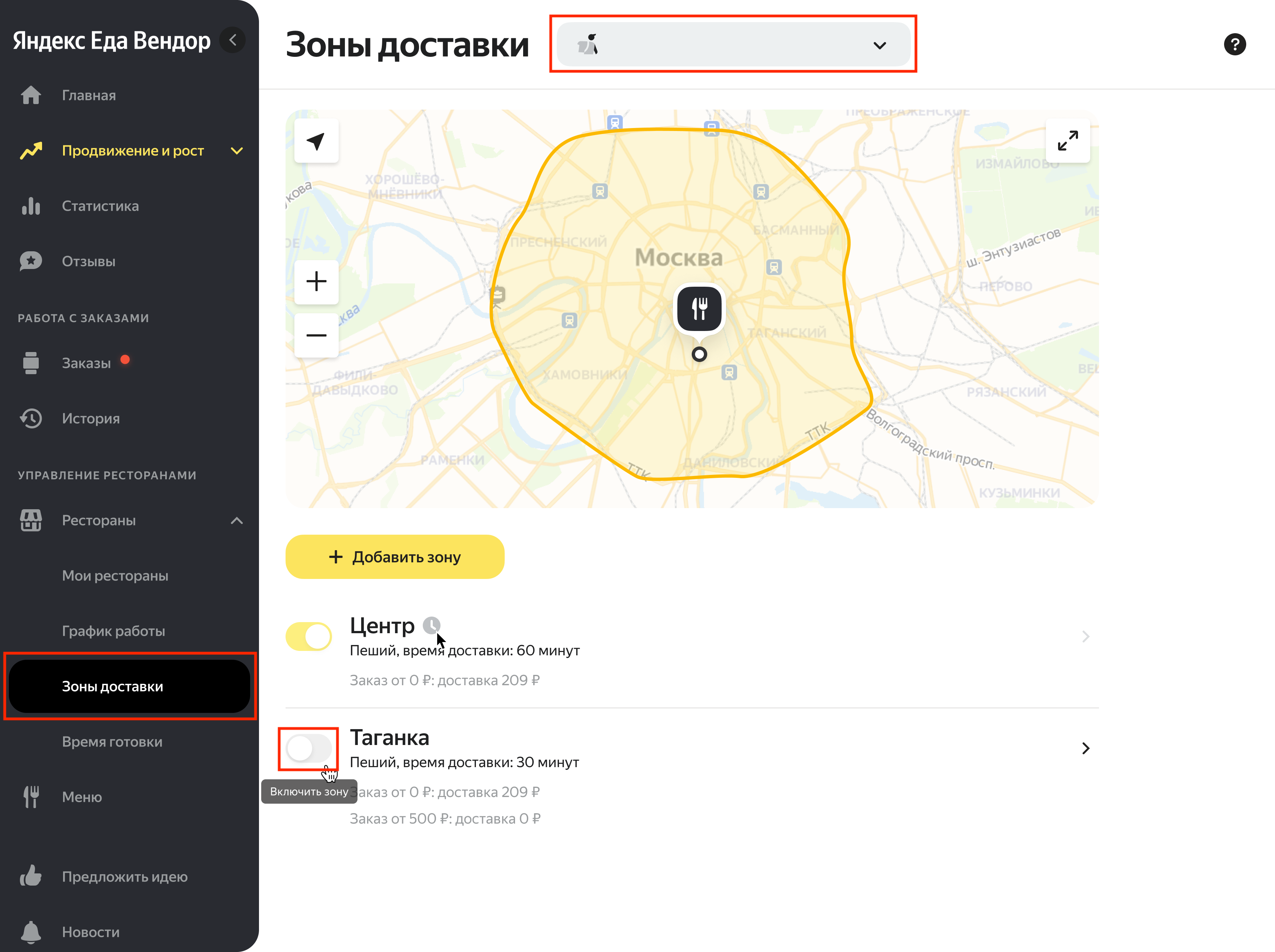Если вы временно не можете доставлять заказы в определенную зону, отключите ее: