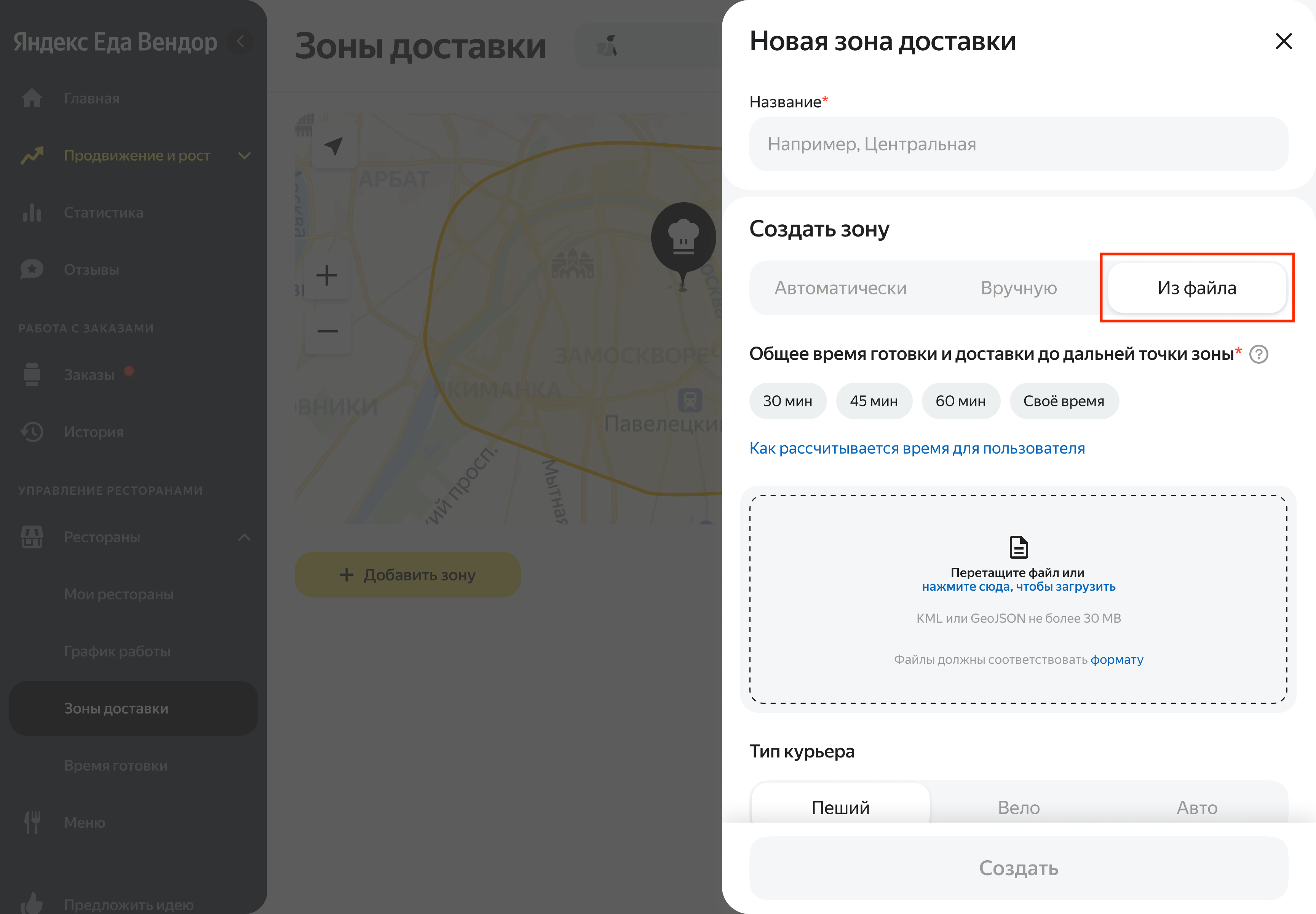 Зона доставки из файла — это зона доставки курьерами ресторана, которую вы передаете нам из файла с геоданными.