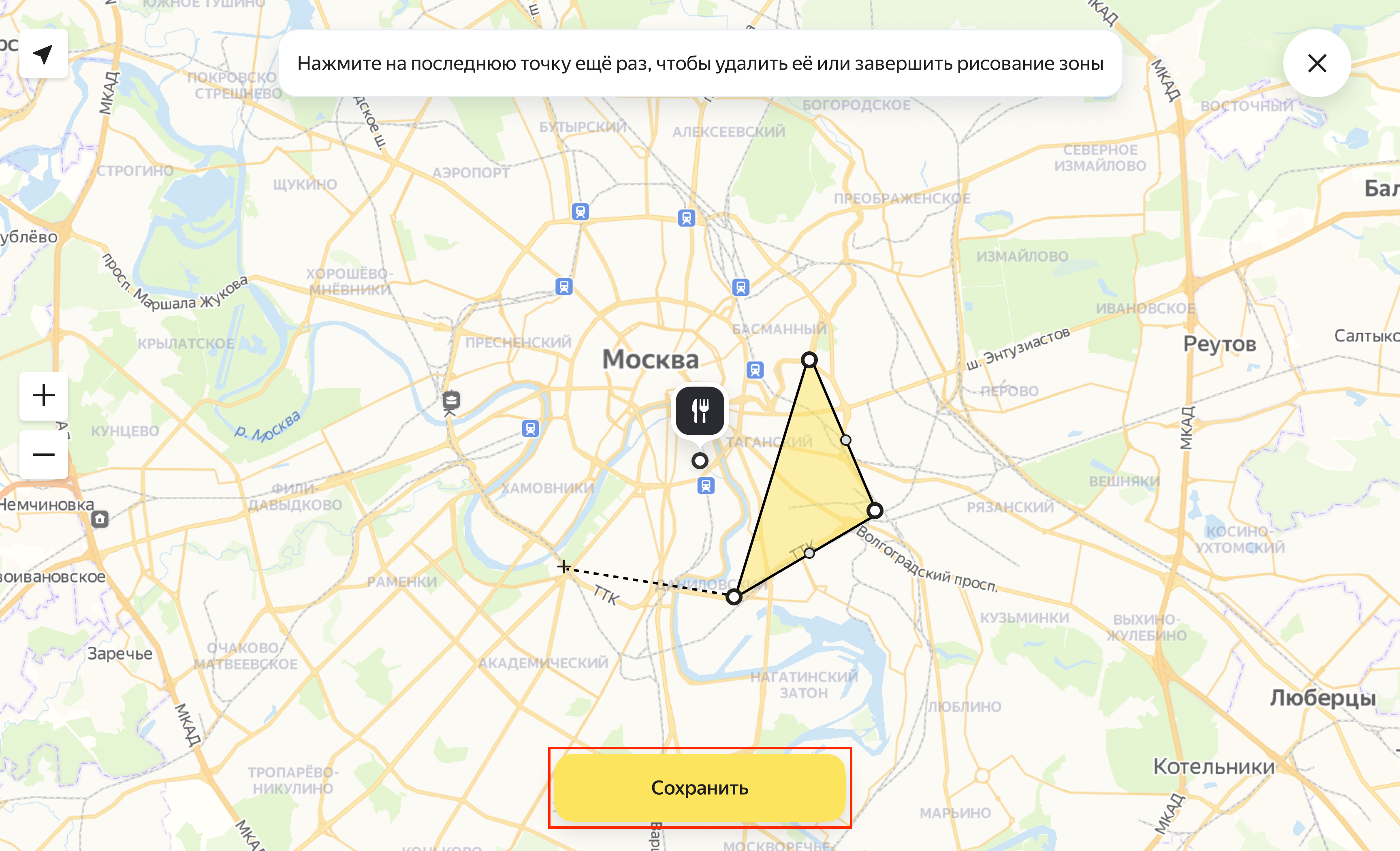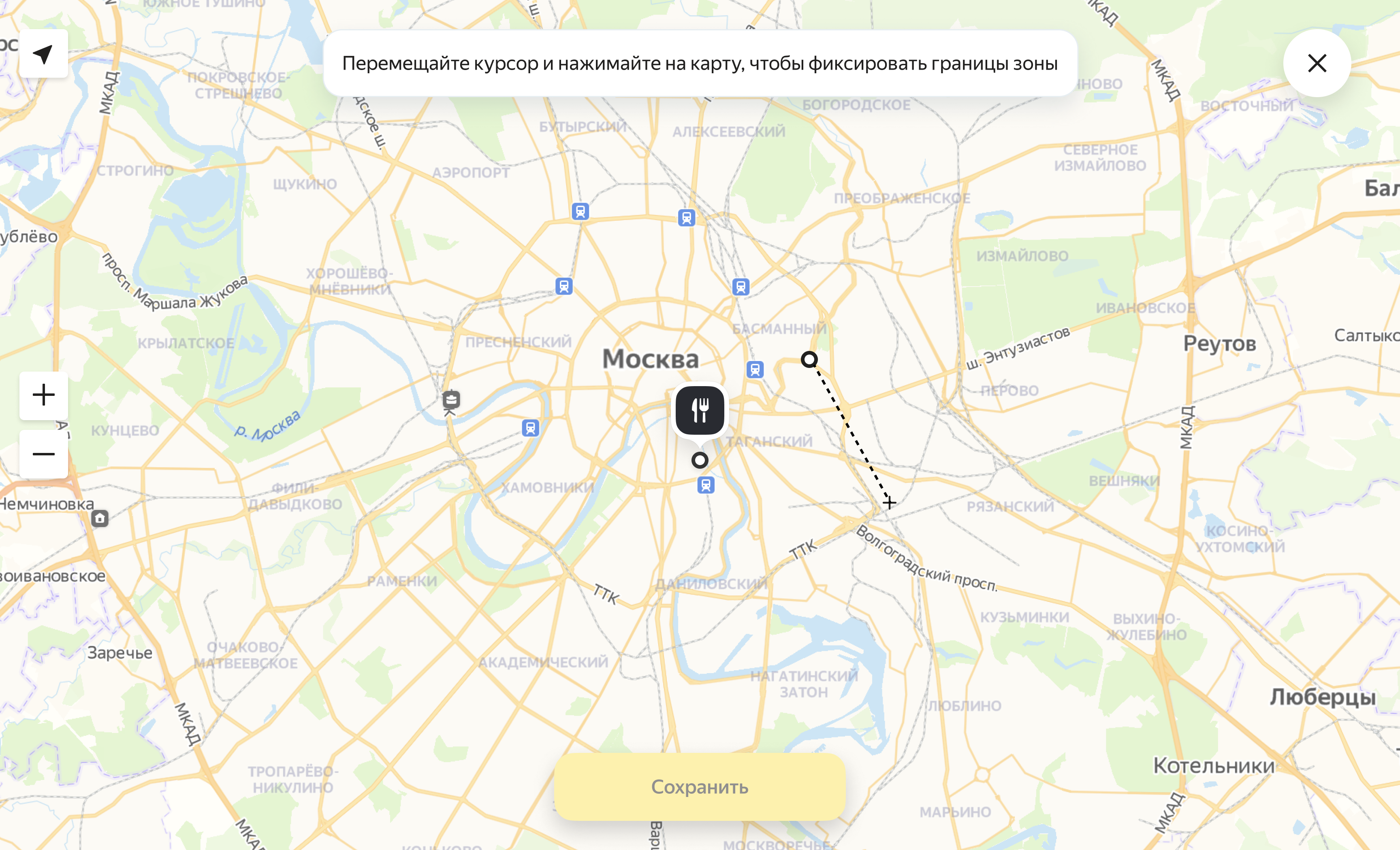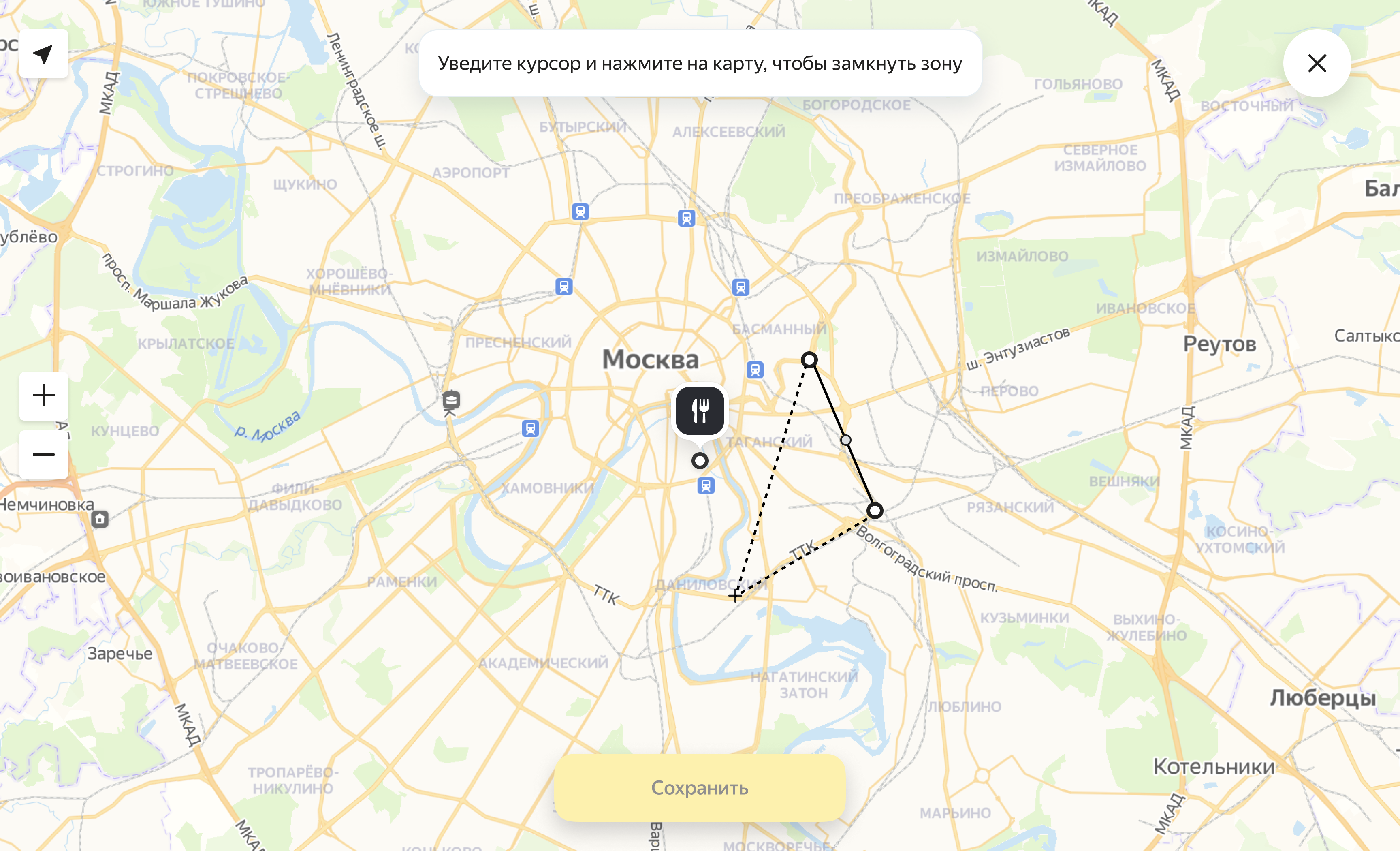 Ручная зона доставки — это зона доставки курьерами ресторана, которую вы рисуете в приложении.