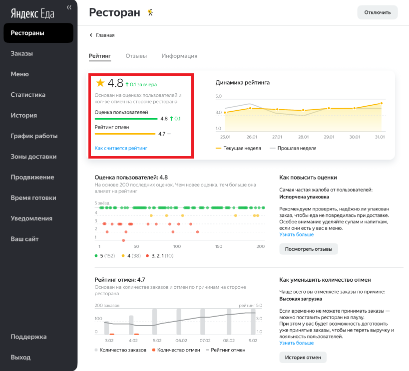 Получить консультацию специалиста по вашим показателям можно через личный кабинет → раздел Поддержка → Сотрудничество и продвижение → Консультация по показателям. Если вы считаете, что оценка или отмена не связана с качеством работы ресторана, оставьте запрос на ее удаление из расчета рейтинга через личный кабинет → раздел Поддержка → Вопрос по заказу → Удалить оценку или отмену.