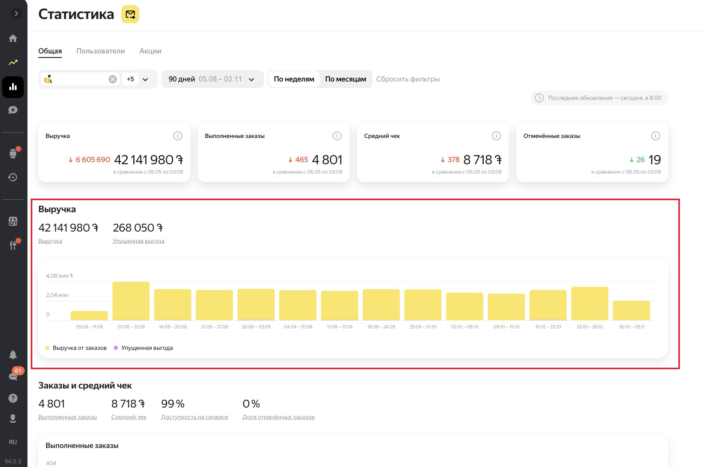 Выручка — сумма чеков всех заказов. Серым обозначены заказы, отмененные по вине ресторана