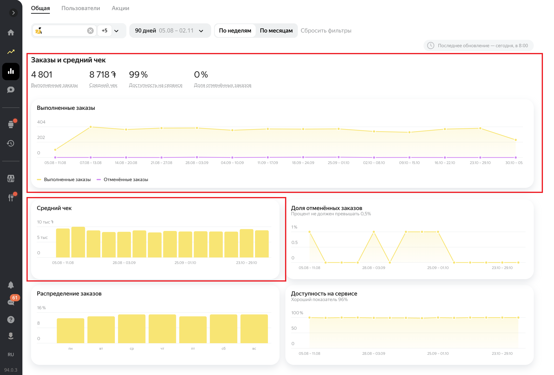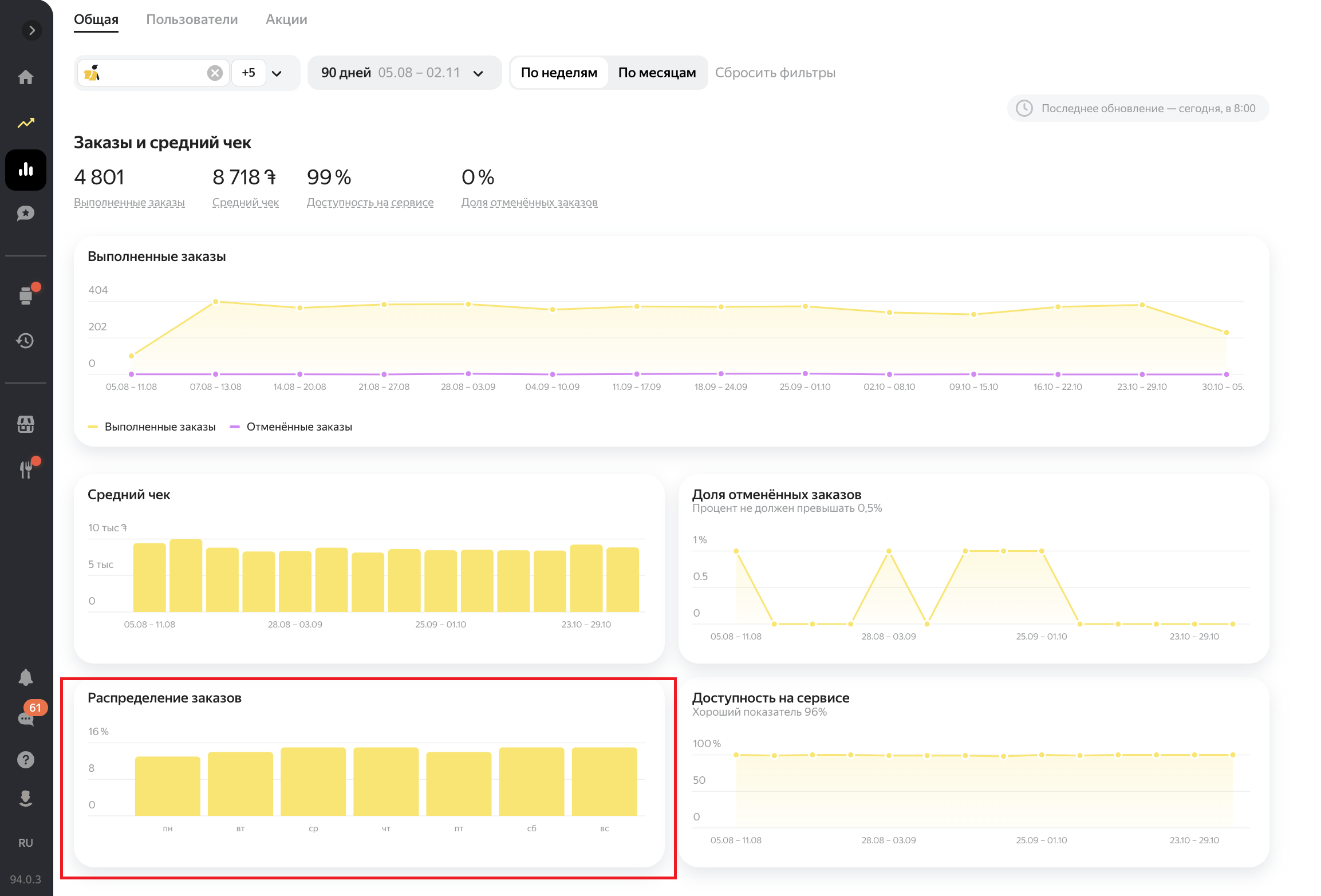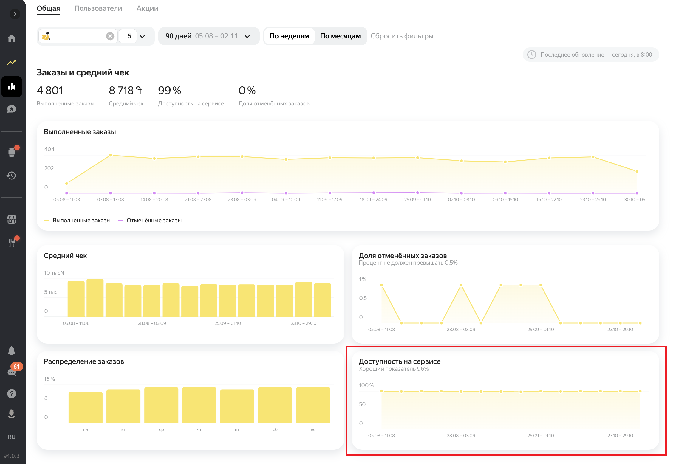 Доступность на сервисе — динамика доступности вашего ресторана. Хорошим показателем считается 96% и выше