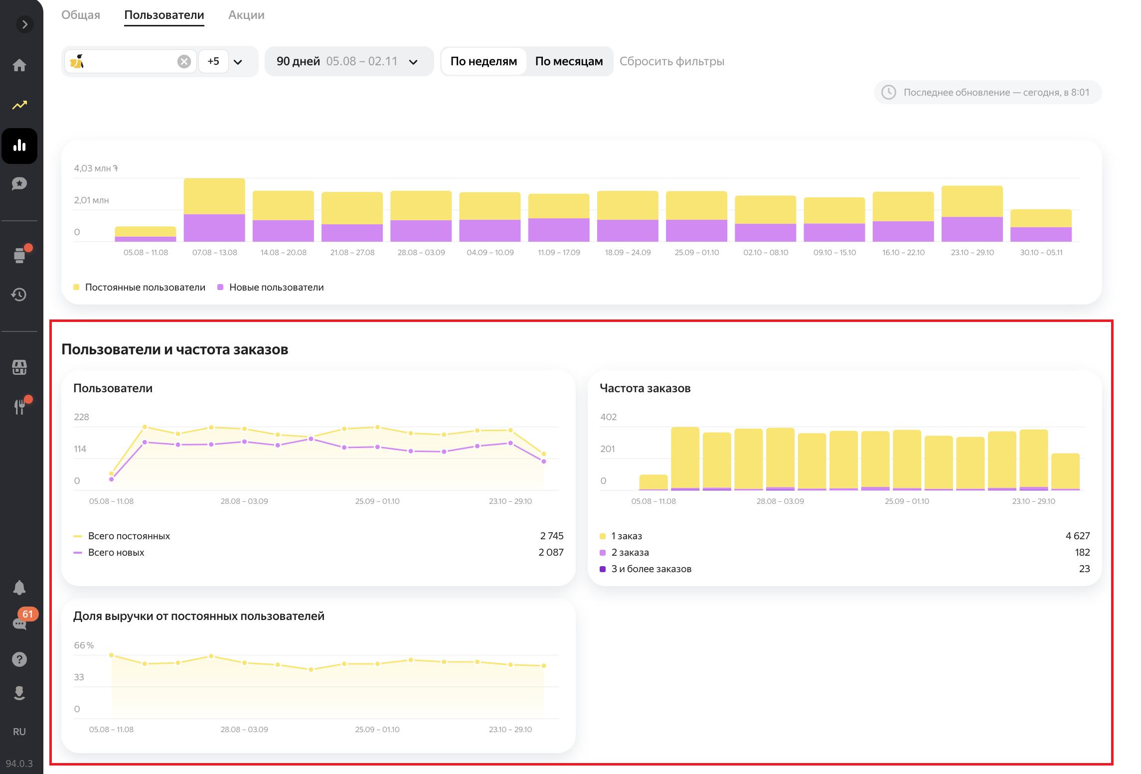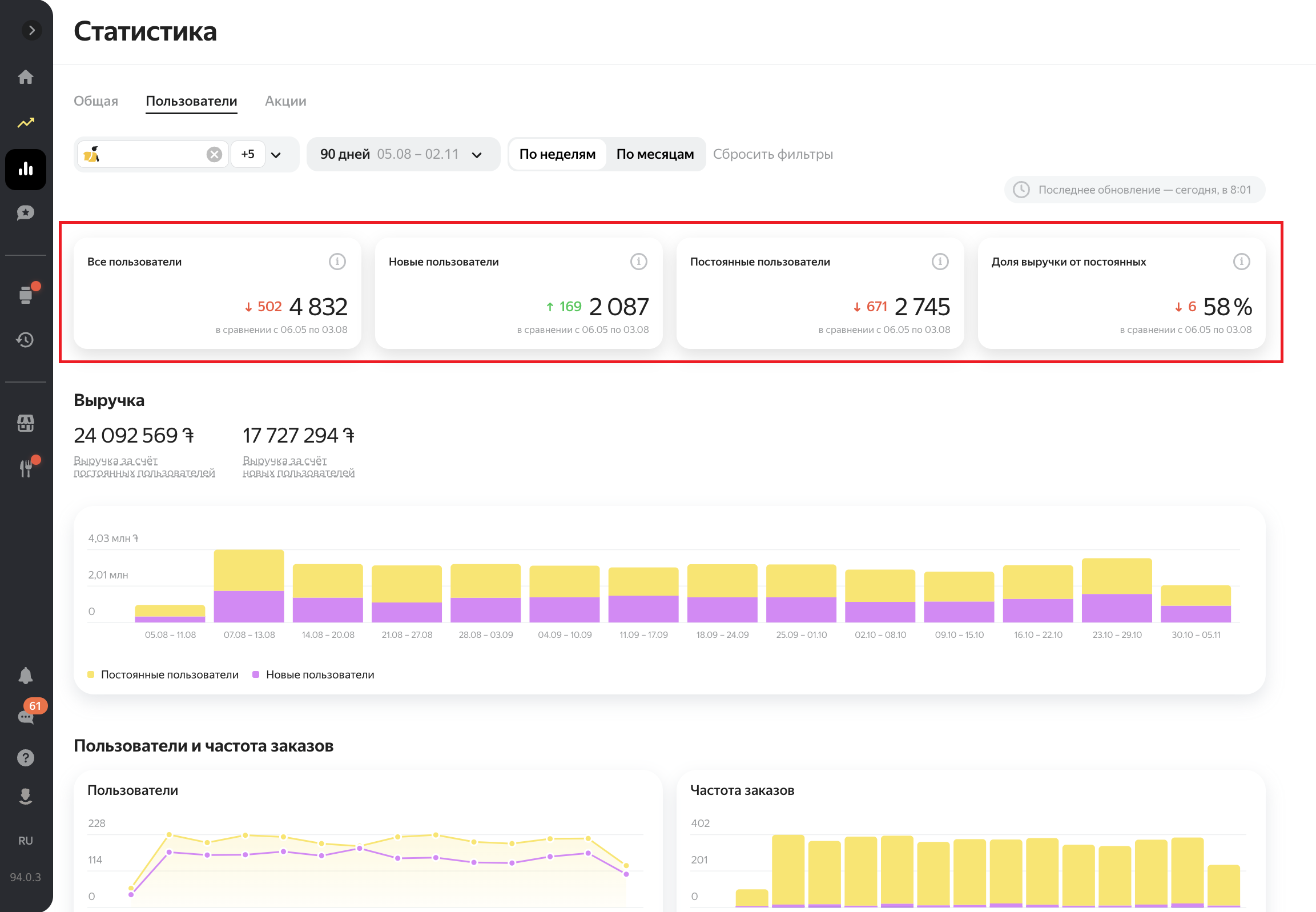 - Постоянные пользователи — количество пользователей, которые уже делали у вас заказы