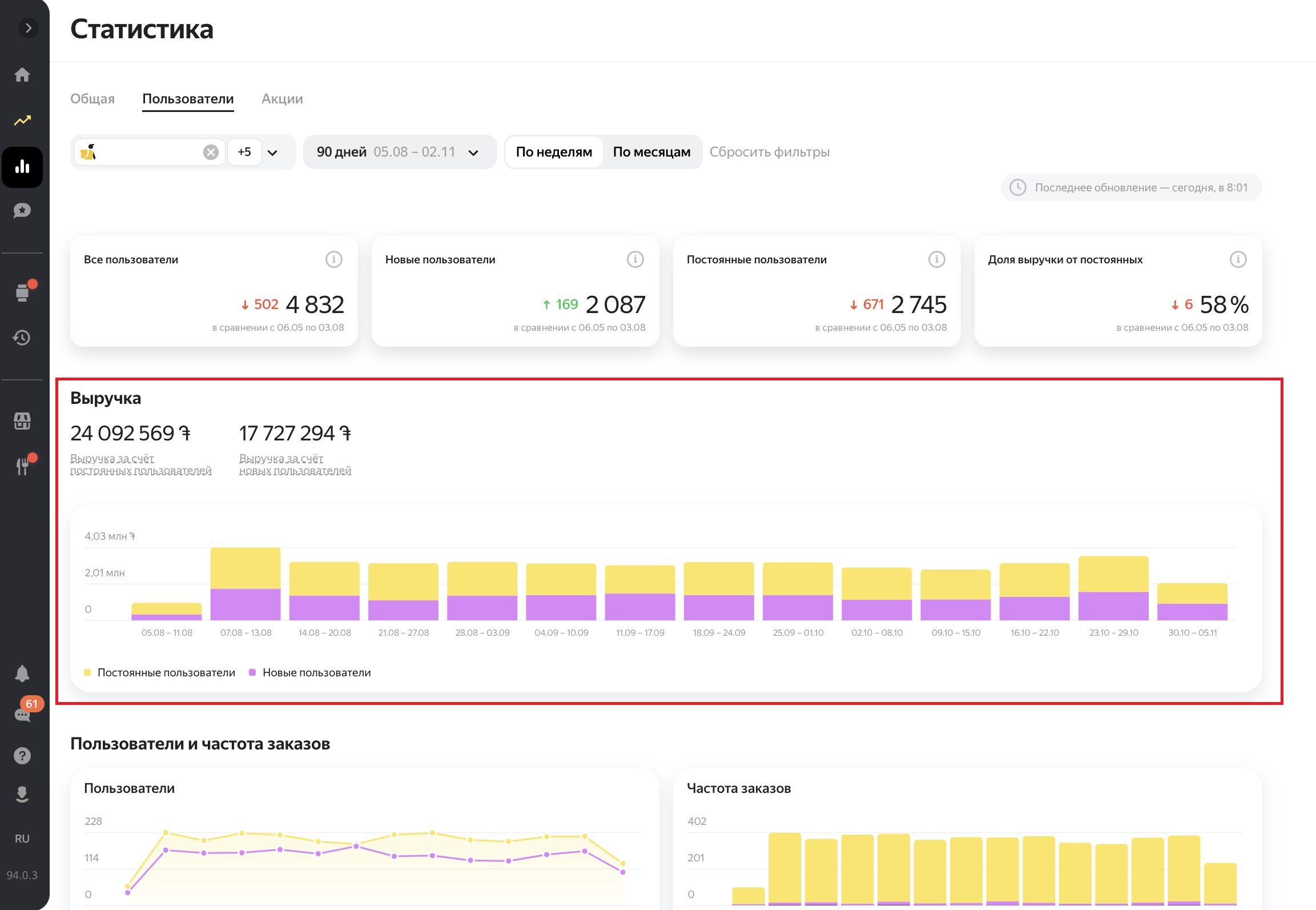 - Доля выручки от постоянных — сумма чеков по заказам от постоянных пользователей