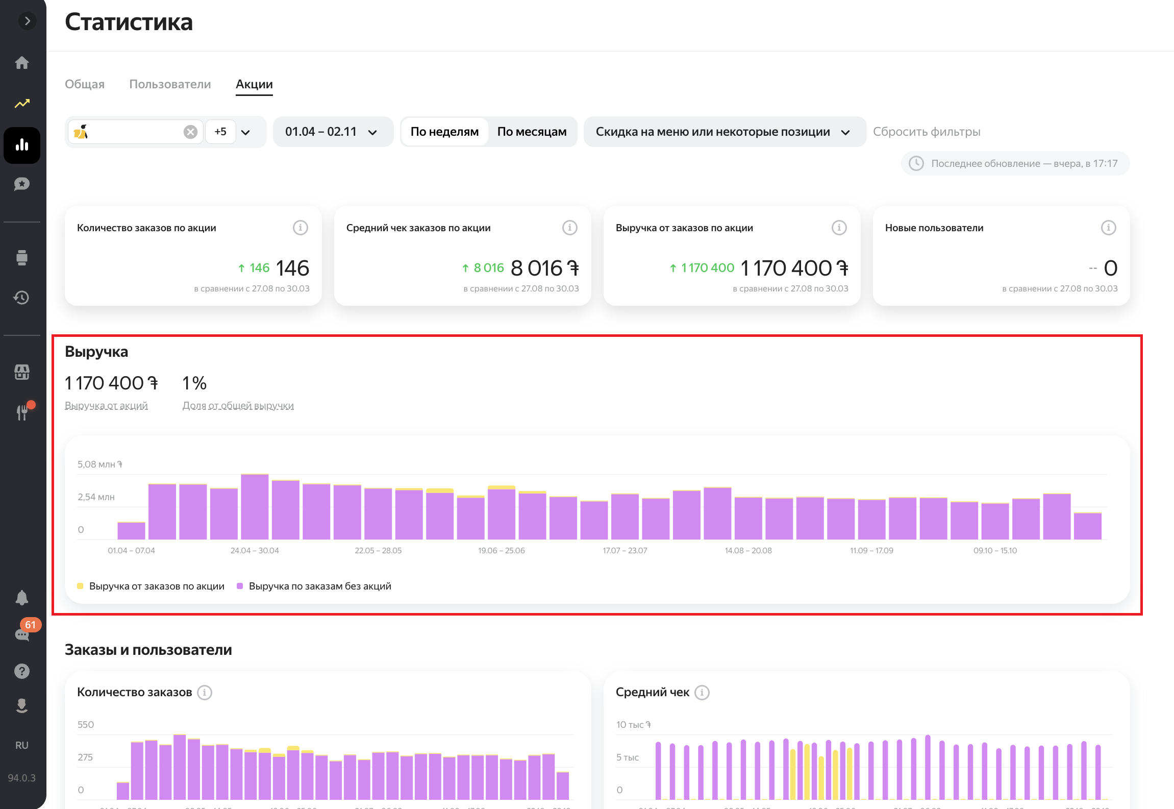 Выручка от заказов по акции — сумма чеков всех заказов: выполненных или отмененных с компенсацией ресторану, минус скидка