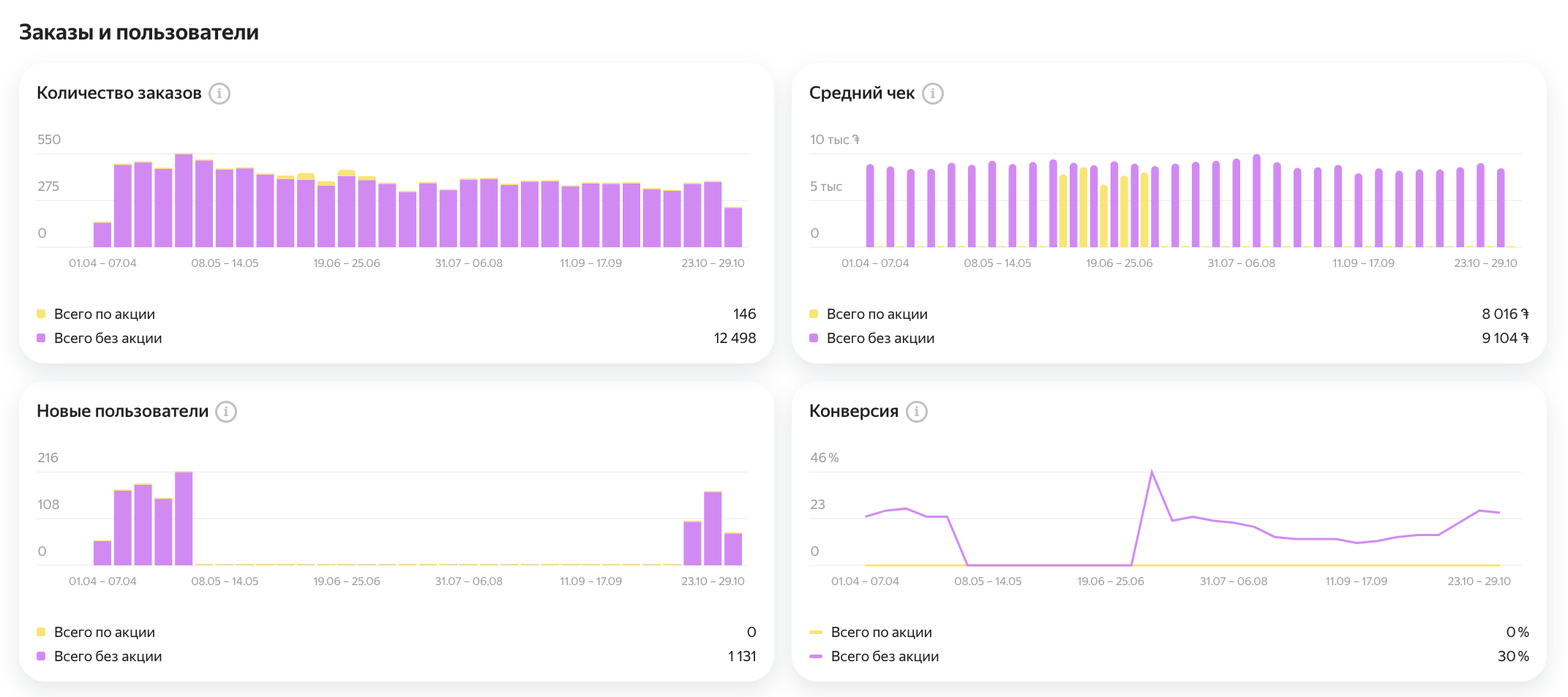 Средний чек заказов по акции — выручка от заказов по акции, разделенная на количество заказов