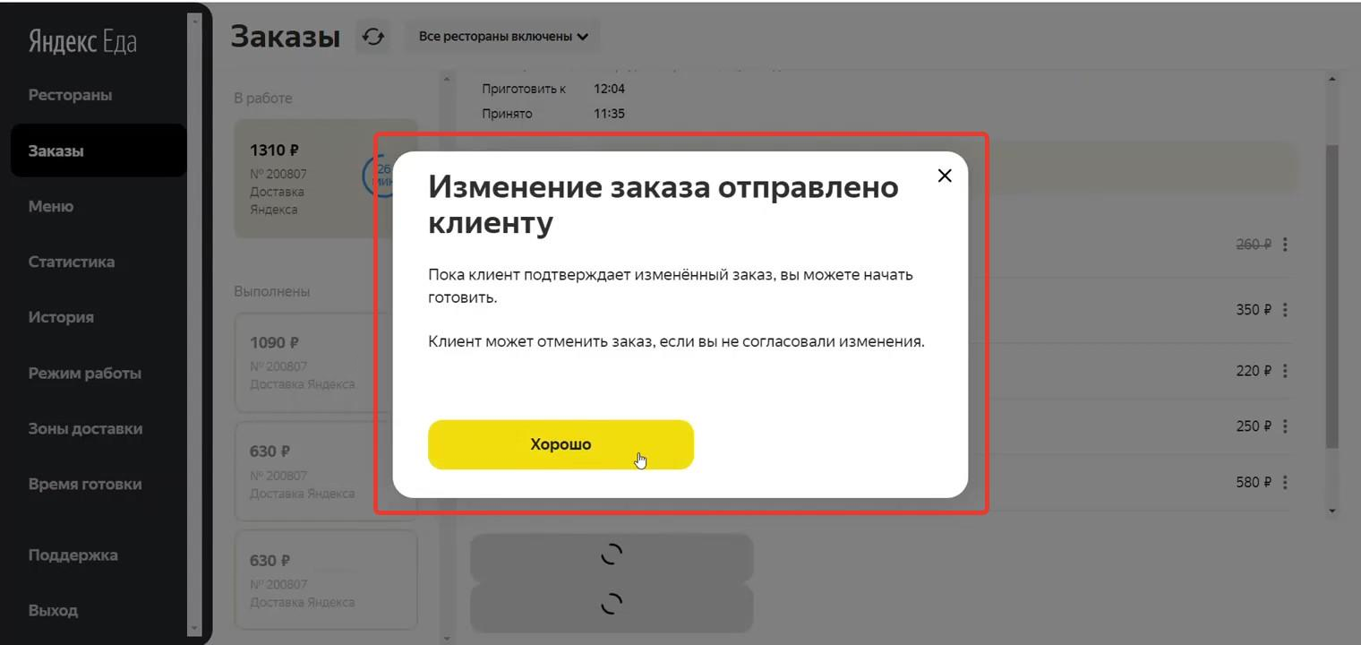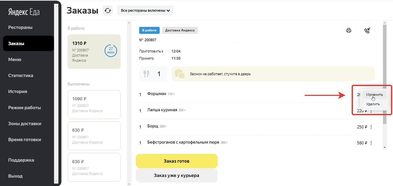 После разговора с пользователем нужно будет внести изменения в состав заказа. Вносить изменения можно до и после подтверждения заказа. Когда начнете редактировать, будет 15 минут, чтобы успеть все поменять и сохранить. При этом время приготовления, рассчитанное для этого заказа, будет на паузе.