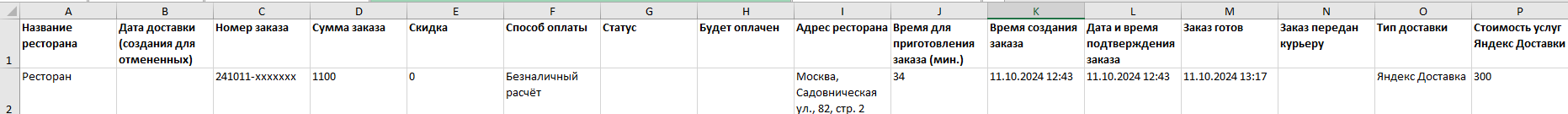 дата доставки (создания для отмененных) — с помощью этого столбца можно узнать, когда именно ресторан подтвердил или отменил заказ;