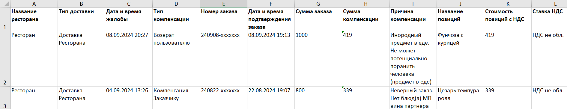 сумма компенсации — стоимость заказа или блюд, по которым произошел возврат или компенсация пользователю;