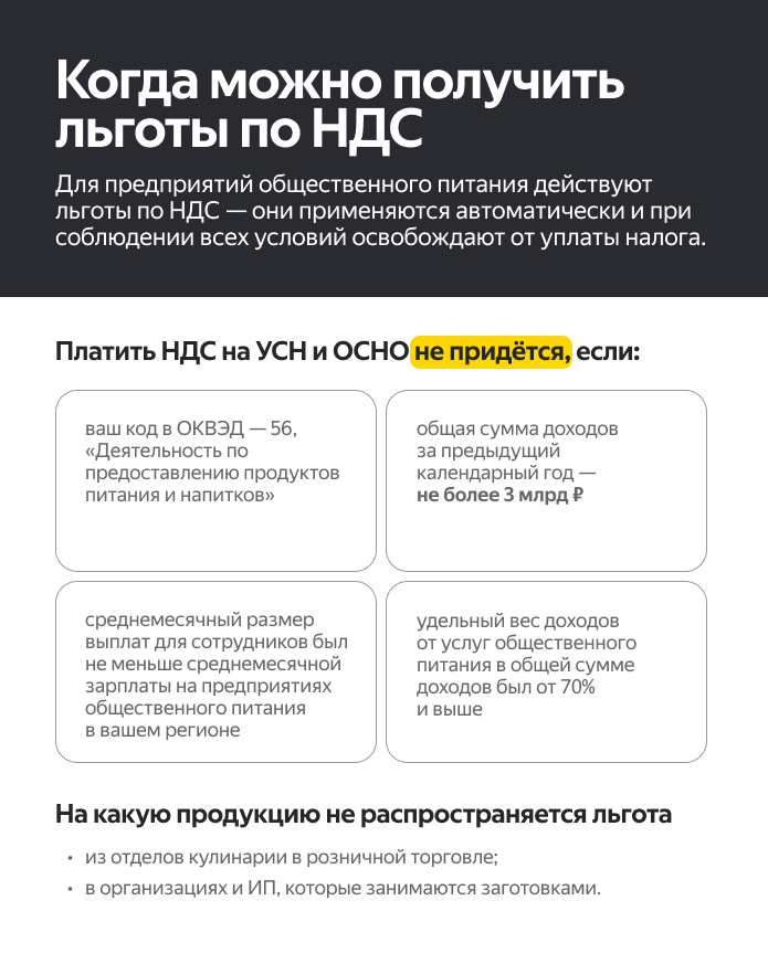 - если в течение всего 2025 года доход не превысил 60 млн ₽ — ресторан не облагается НДС;