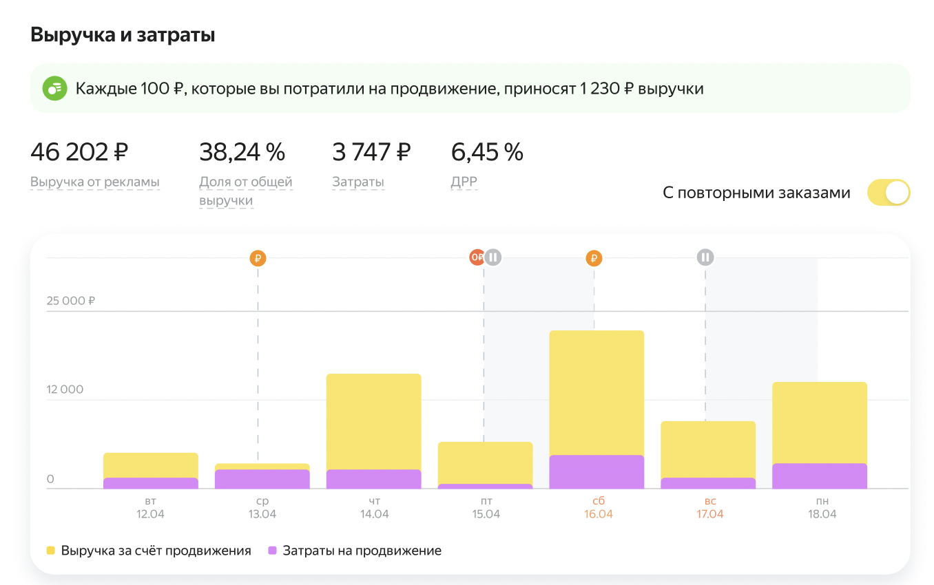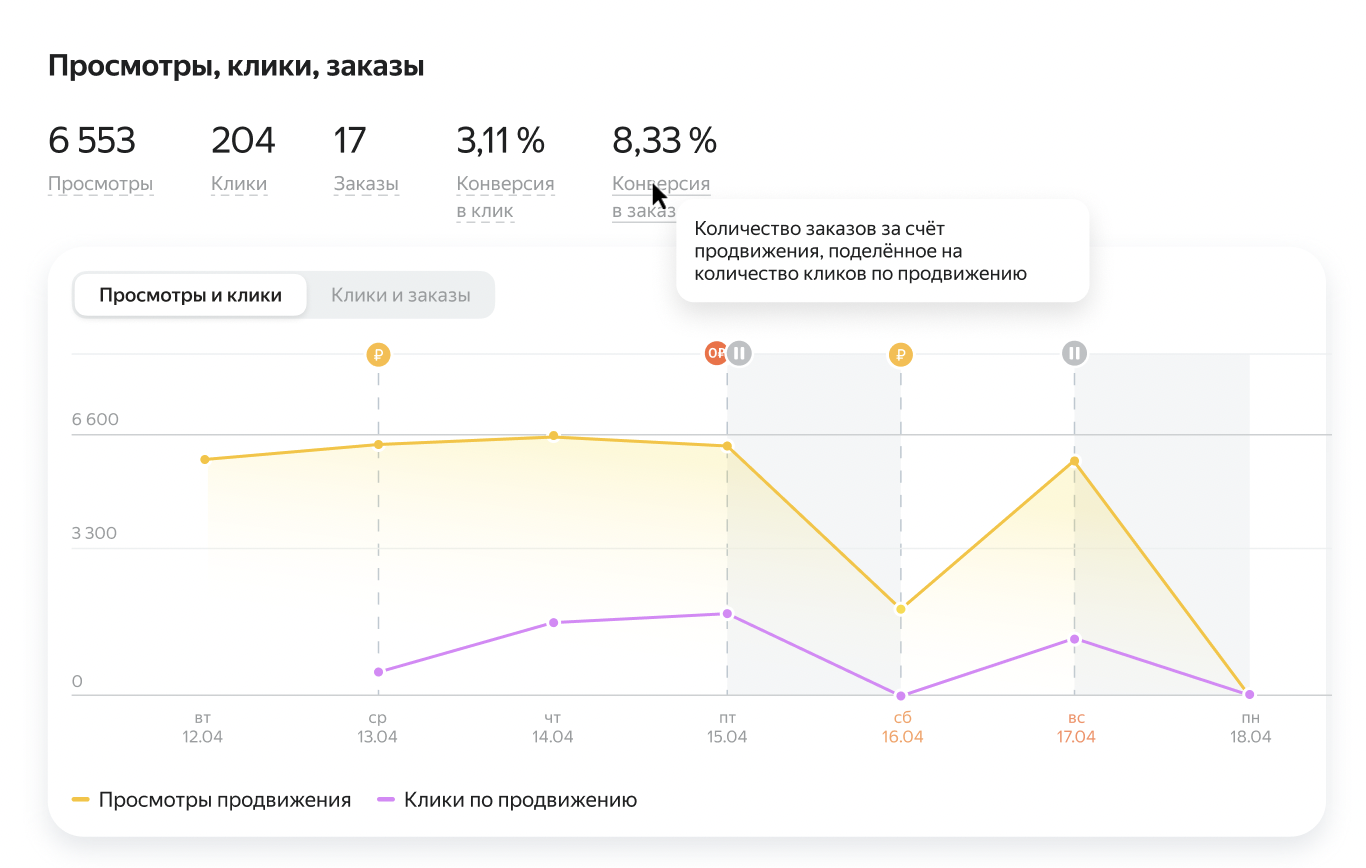 А еще значки помогут лучше понимать динамику заказов — покажут, как настройки кампании влияют на эффективность продвижения.
