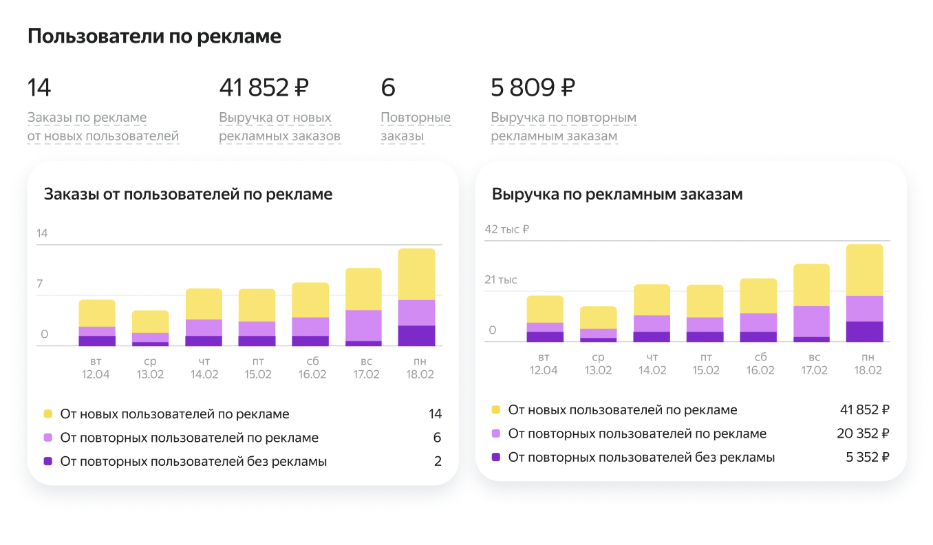 Новые пользователи — пользователи, которые впервые совершили заказ благодаря рекламе.