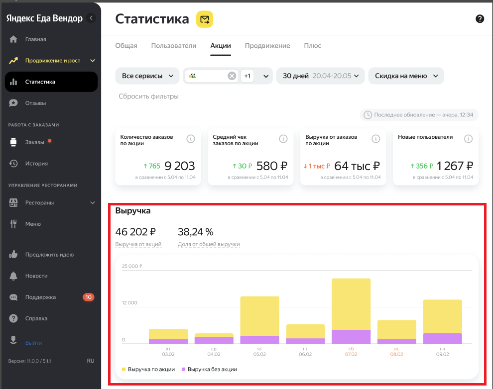 Выручка от заказов по акции — сумма чеков всех заказов: выполненных или отмененных с компенсацией ресторану, минус скидка.