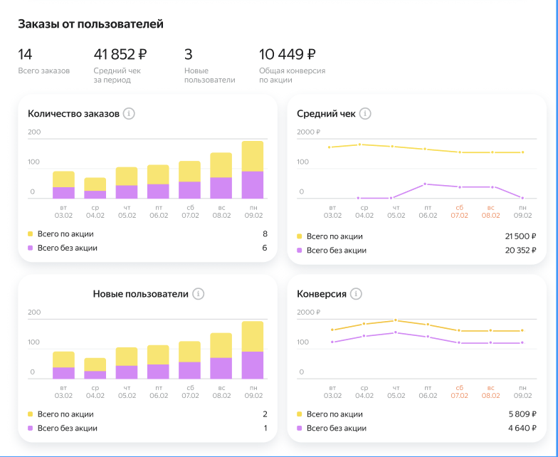 - Цифра на графиках — это сумма значений за выбранный период, кроме графика с конверсией в заказ: там посчитано среднее.