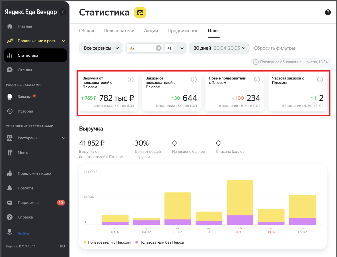 Новые пользователи с Плюсом — количество пользователей с подпиской на Яндекс Плюс, которые впервые сделали заказ в вашем ресторане.