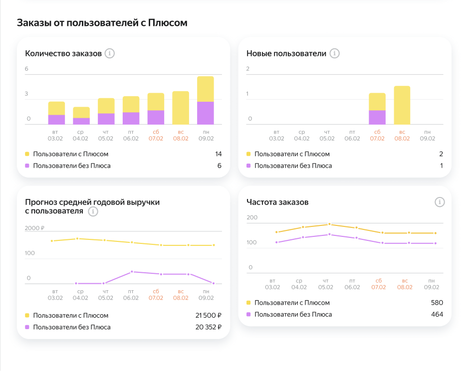 Общее количество заказов в статистике может минимально отличаться от общего количества заказов пользователей с Плюсом и без него. Так происходит из-за погрешностей в подсчетах системы — в 1-2% случаев она не относит пользователя к определенной группе.
