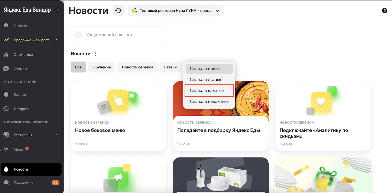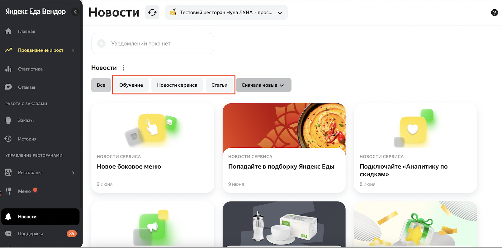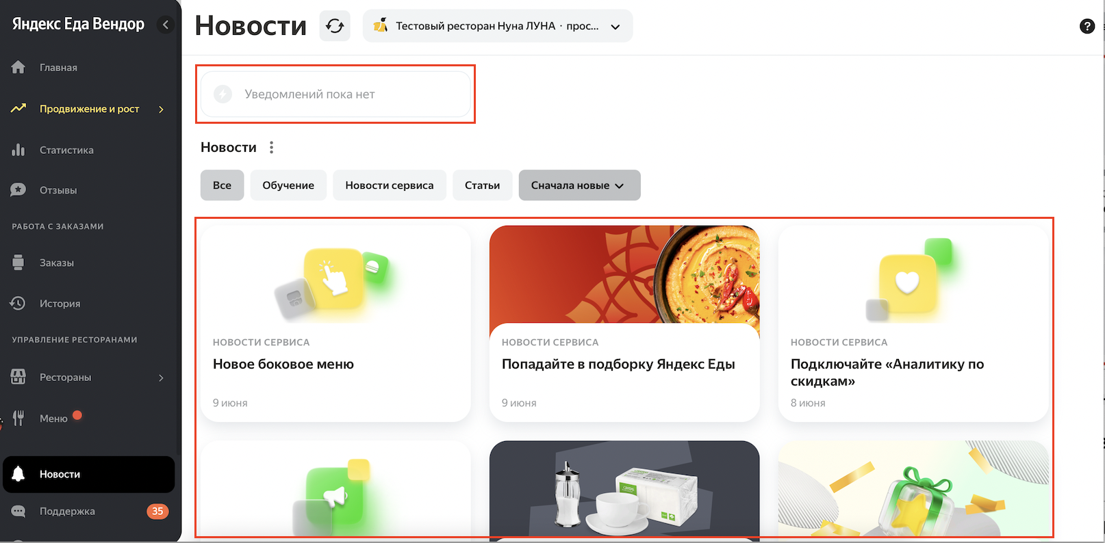 В верхней части страницы будут критичные или важные уведомления, а в нижней — новости. Уведомления — это критичные сообщения про работу ресторана, а Новости — это сообще