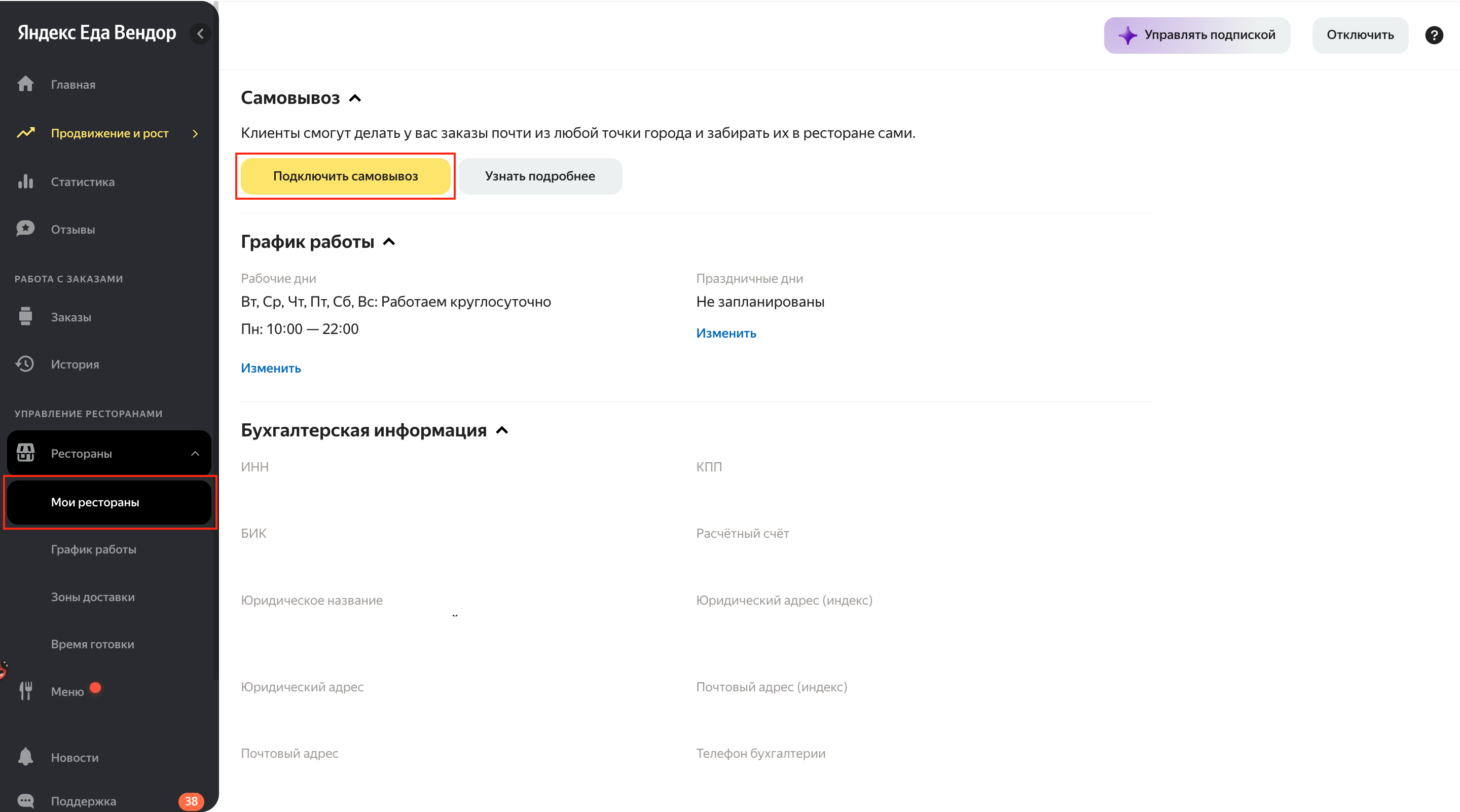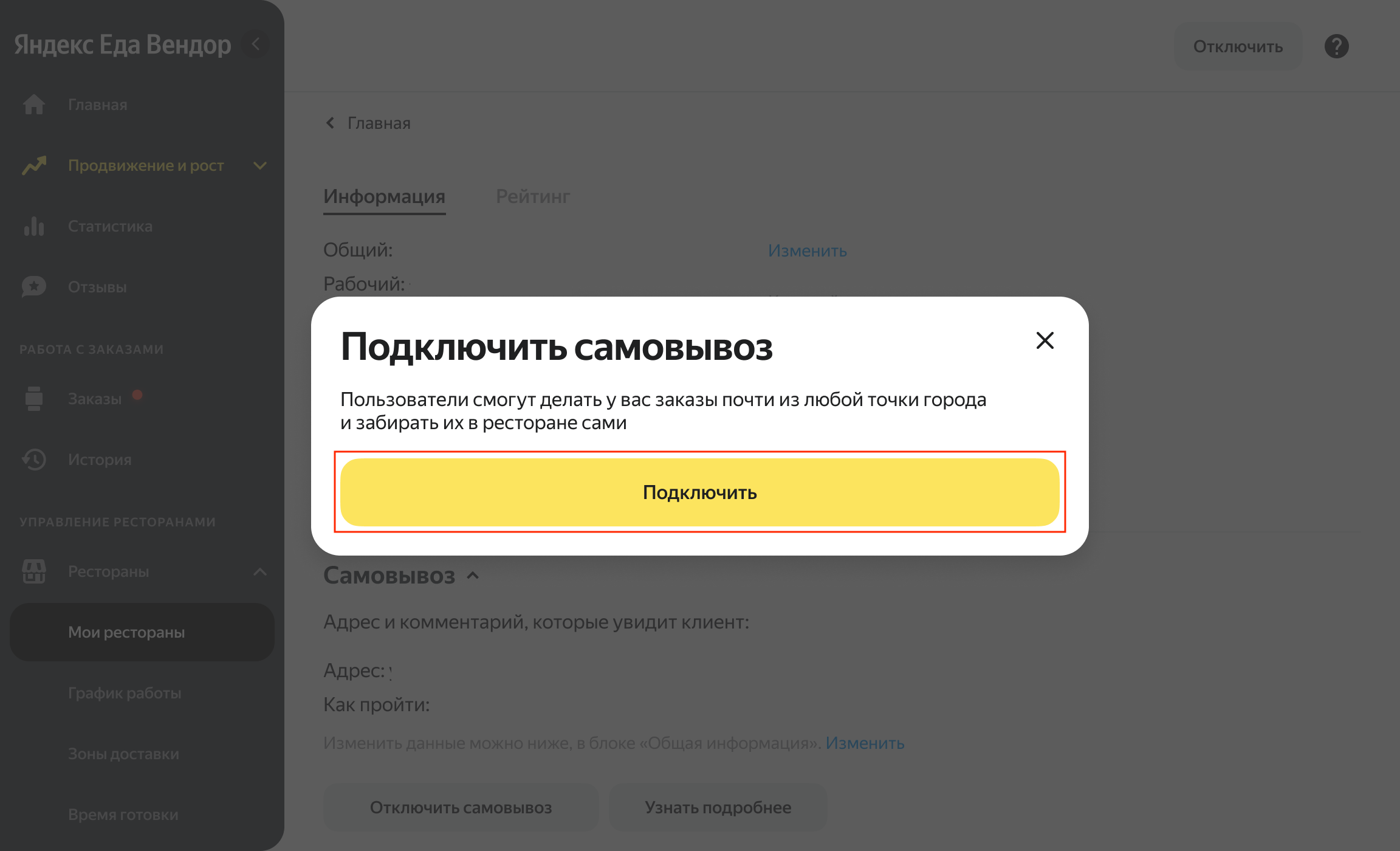 Выберите ресторан и в блоке Самовывоз нажмите Подключить самовывоз.