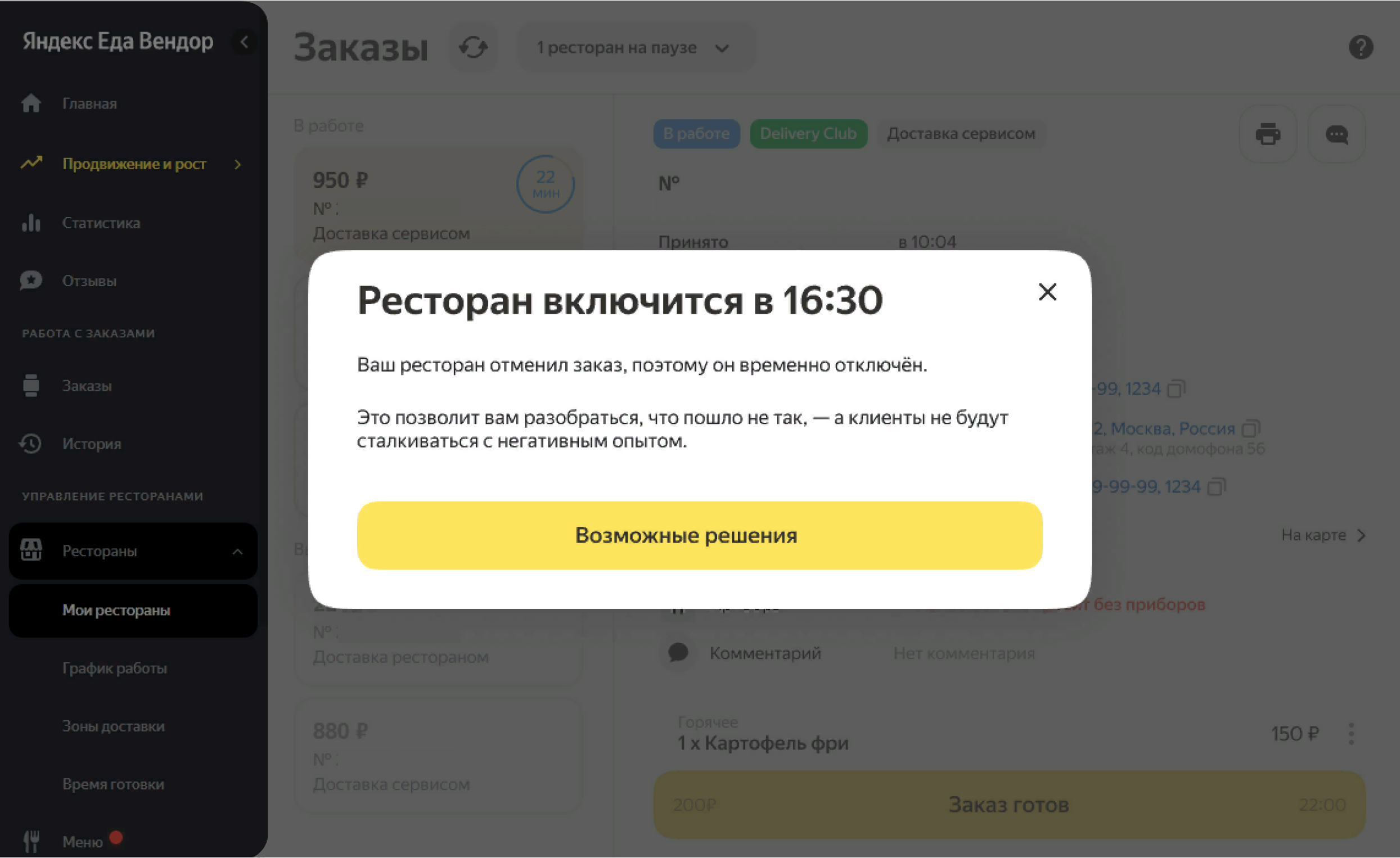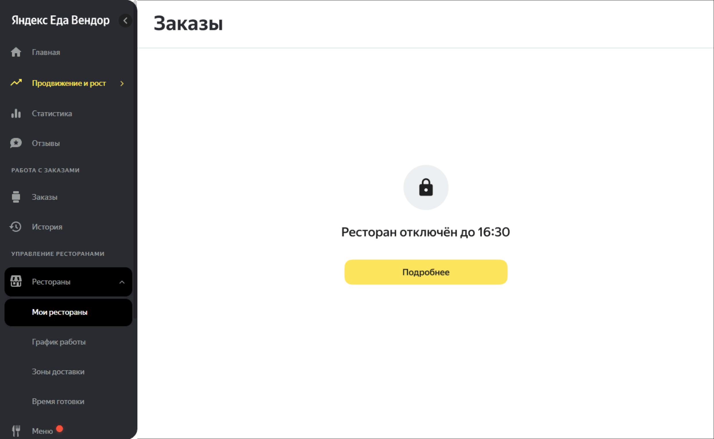 Вы можете перейти по кнопке Подробнее, чтобы посмотреть причину и время, когда ресторан снова будет доступен для заказов. После отмены заказа по причине Закрылись раньше указанного в графике работы времени вы можете активировать ресторан в любой момент по кнопке Включить сейчас.