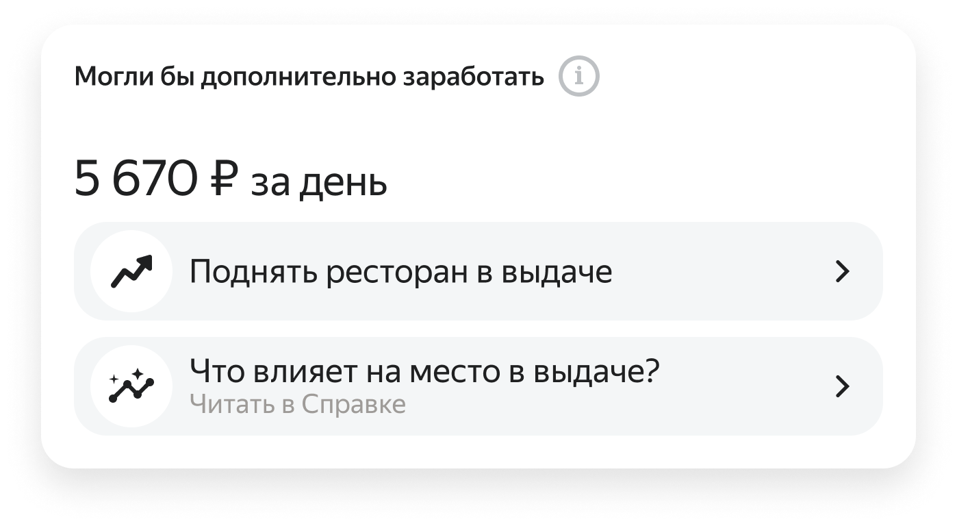 В блоке Могли бы дополнительно заработать вы увидите прогноз дополнительной выручки ресторана за день, если бы его медианное место было выше. Здесь учитываются и другие факторы — например, средний чек или активное Продвижение.