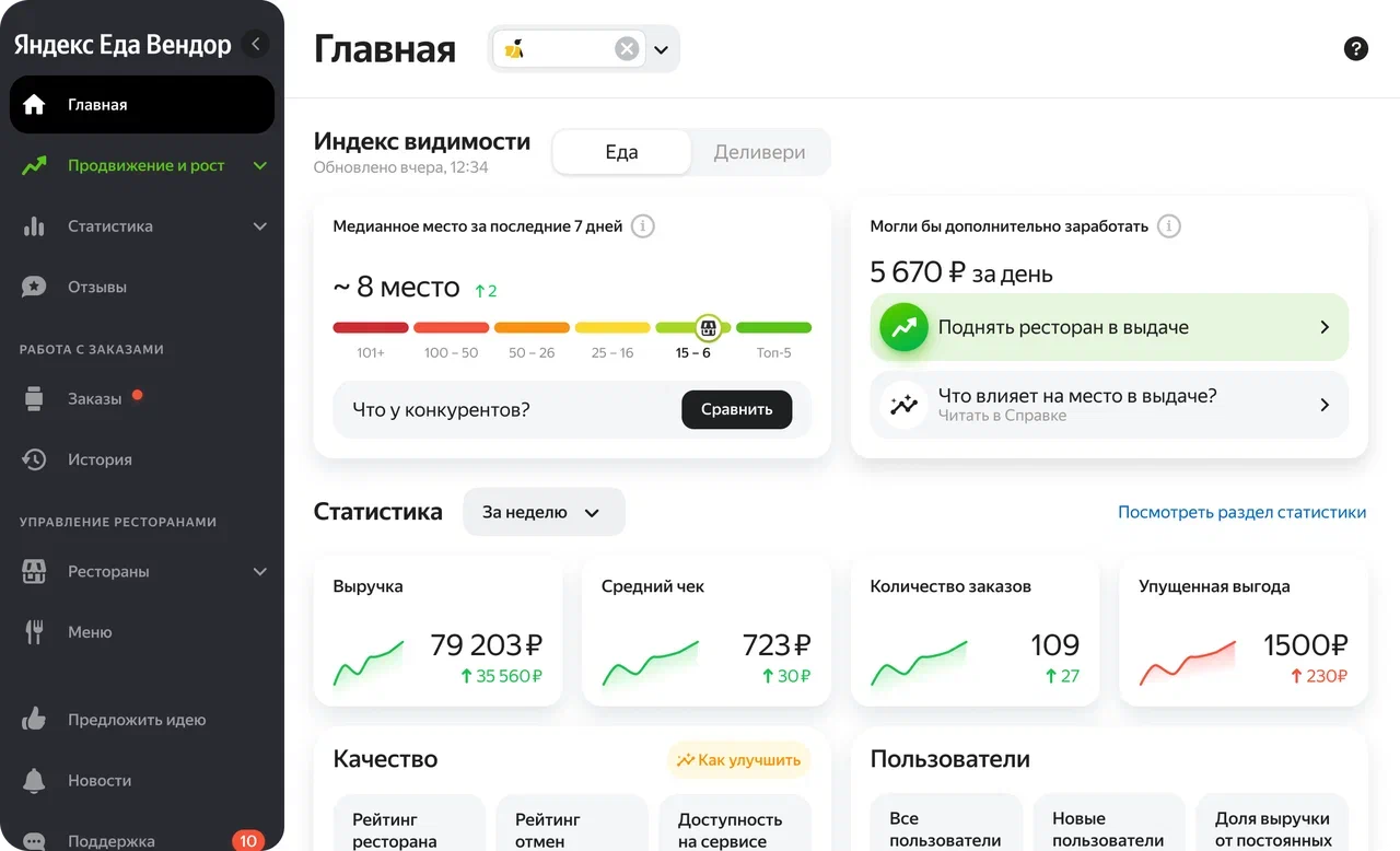 Индекс качества — это раздел, где собраны все важные для пользователей показатели работы ресторана. Здесь можно отслеживать, насколько хорошо ресторан справляется с заказами: готовит, собирает и доставляет их.