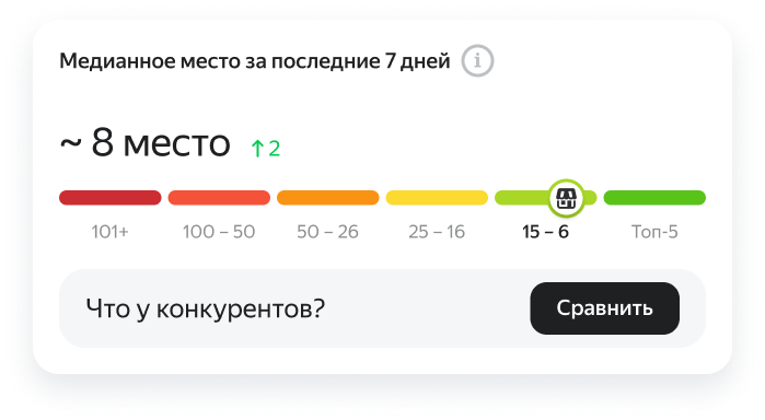 Медианное место — это середина списка между всеми местами в выдаче, которые вы занимали за последние 7 дней. Например, если за неделю ресторан был на местах 2, 4, 5, 6, 7, 8, 9, то медианное место — 6.