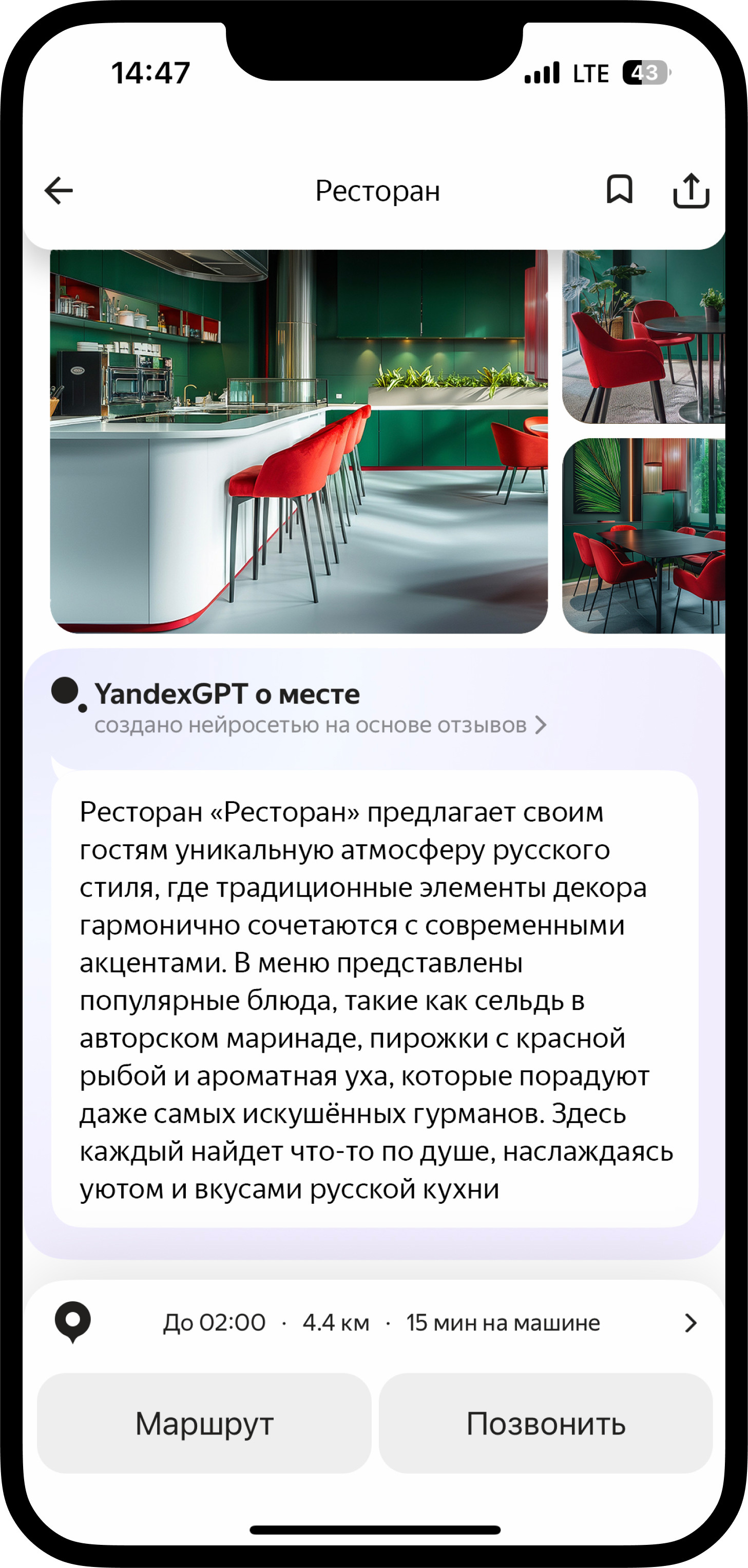 Данные добавляются автоматически из Яндекс Карт и Яндекс Еды, а еще дополняются редакционным контентом — мы помогаем ресторанам оформить карточку и обновляем информацию по их желанию.