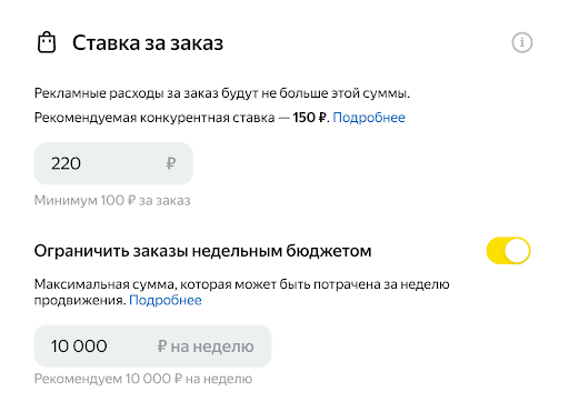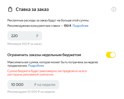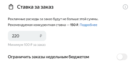Рекомендуем выбирать такую ставку за заказ, которая подходит именно вашему бюджету — в диапазоне от 100 до 1000 рублей. Размер ставки влияет на частоту показа и место ресторана в выдаче — чем выше ставка, тем чаще ваш ресторан занимает более высокие позиции.