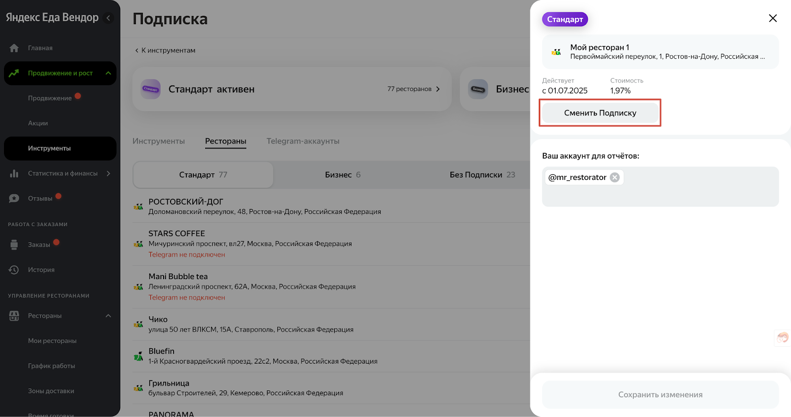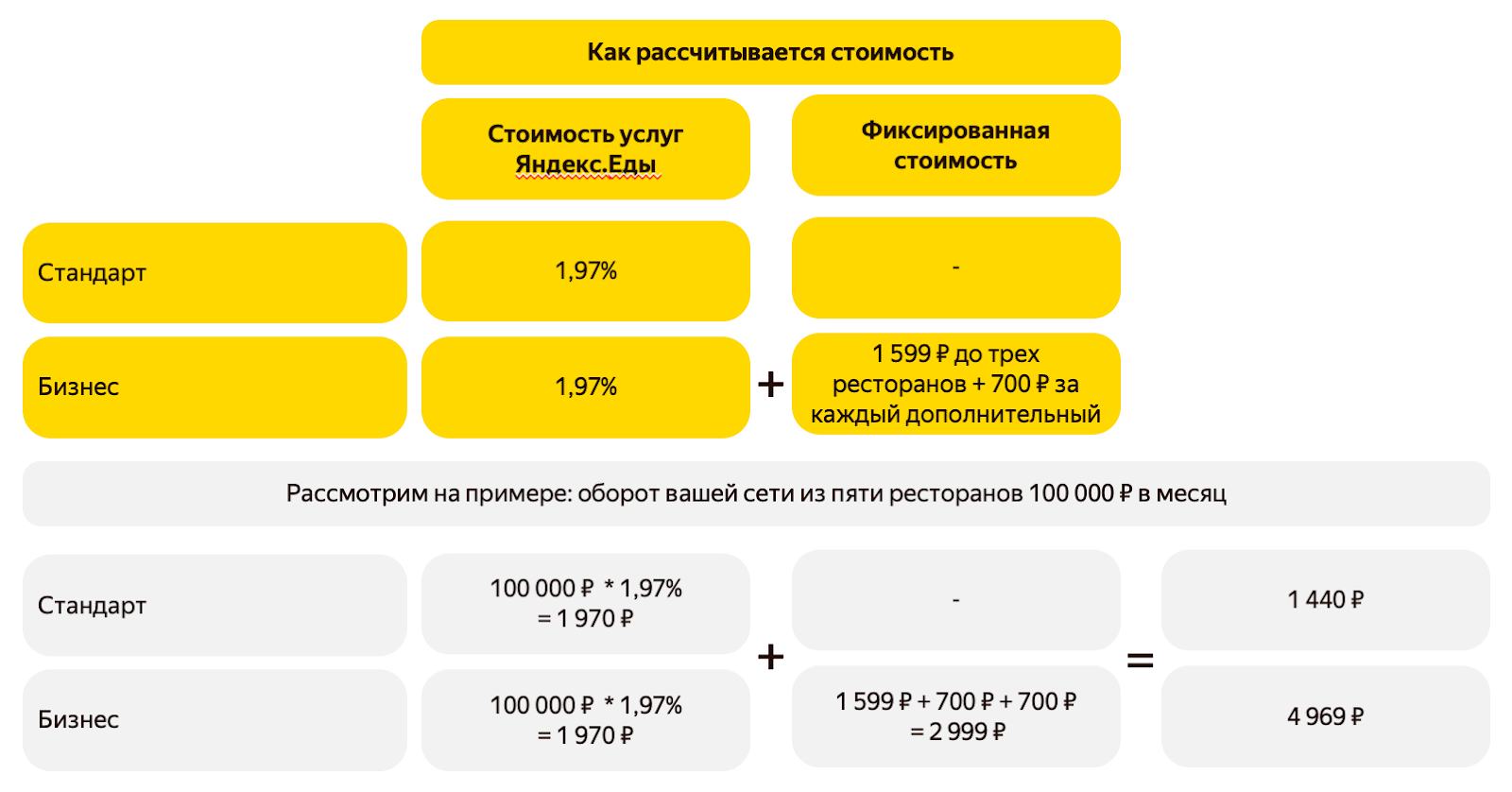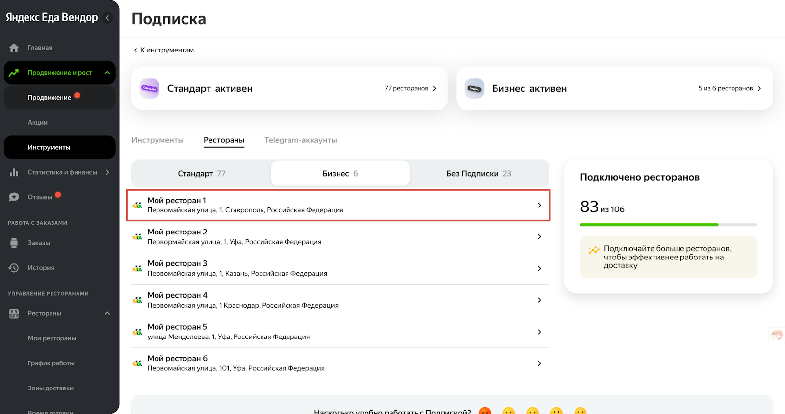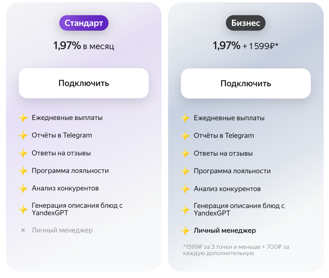 - доплата: +700 ₽ в месяц — за каждый следующий ресторан, если к подписке будет подключено более трех ресторанов.