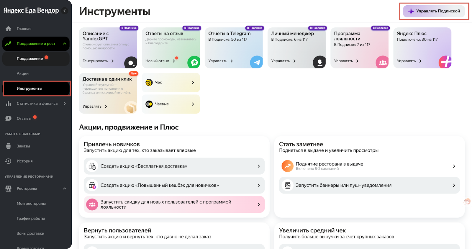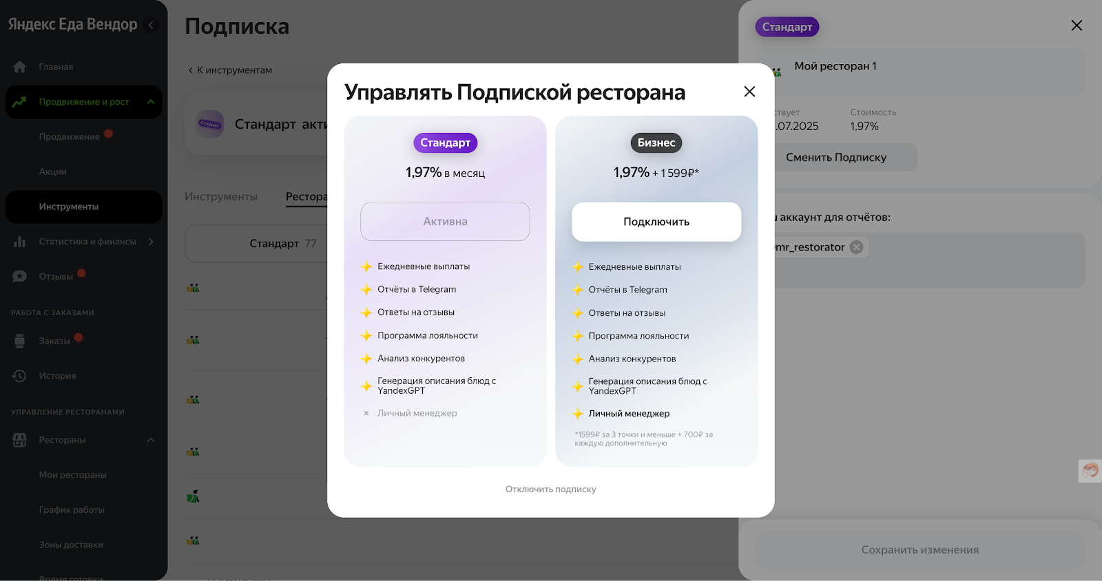 - Для подписки Бизнес к возможностям подписки Стандарт добавляется работа с личным менеджером, который поможет разобраться в тонкостях работы на доставку и эффективнее выстроить процессы.