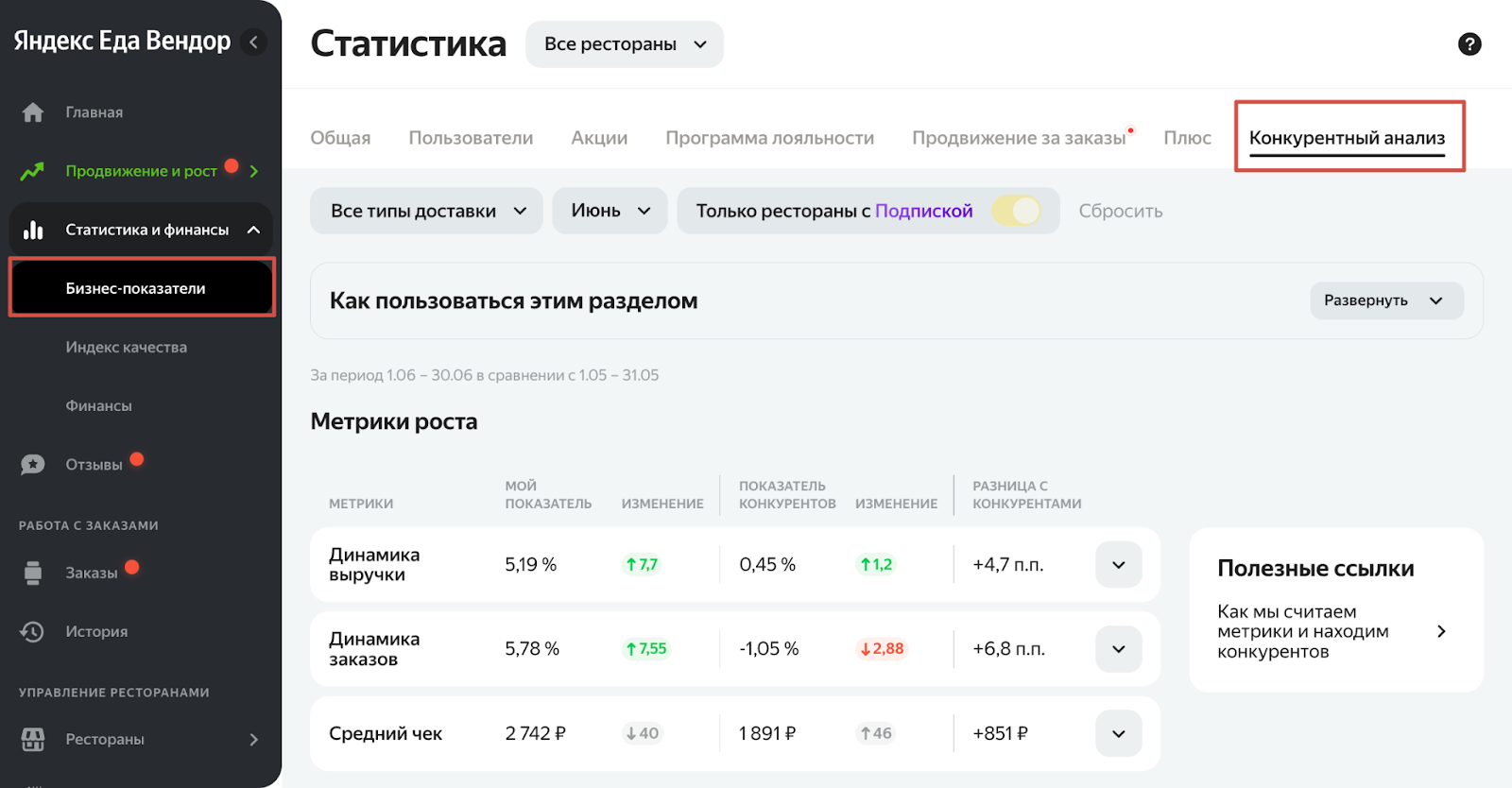 Конкурентный анализ — это раздел с подробной статистикой по вашим ресторанам и ресторанам конкурентов. Он покажет, как развивается ваш ресторан: насколько и по каким метрикам он отличается от конкурентов.