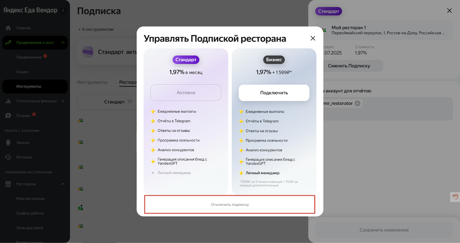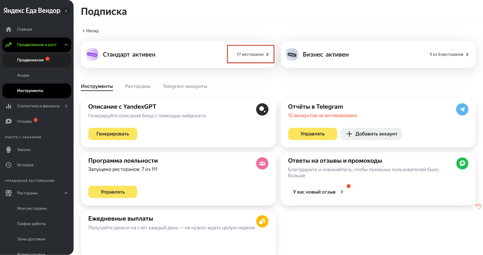 - доплата: +700 ₽ в месяц — за каждый следующий ресторан, если к подписке будет подключено более трех ресторанов.