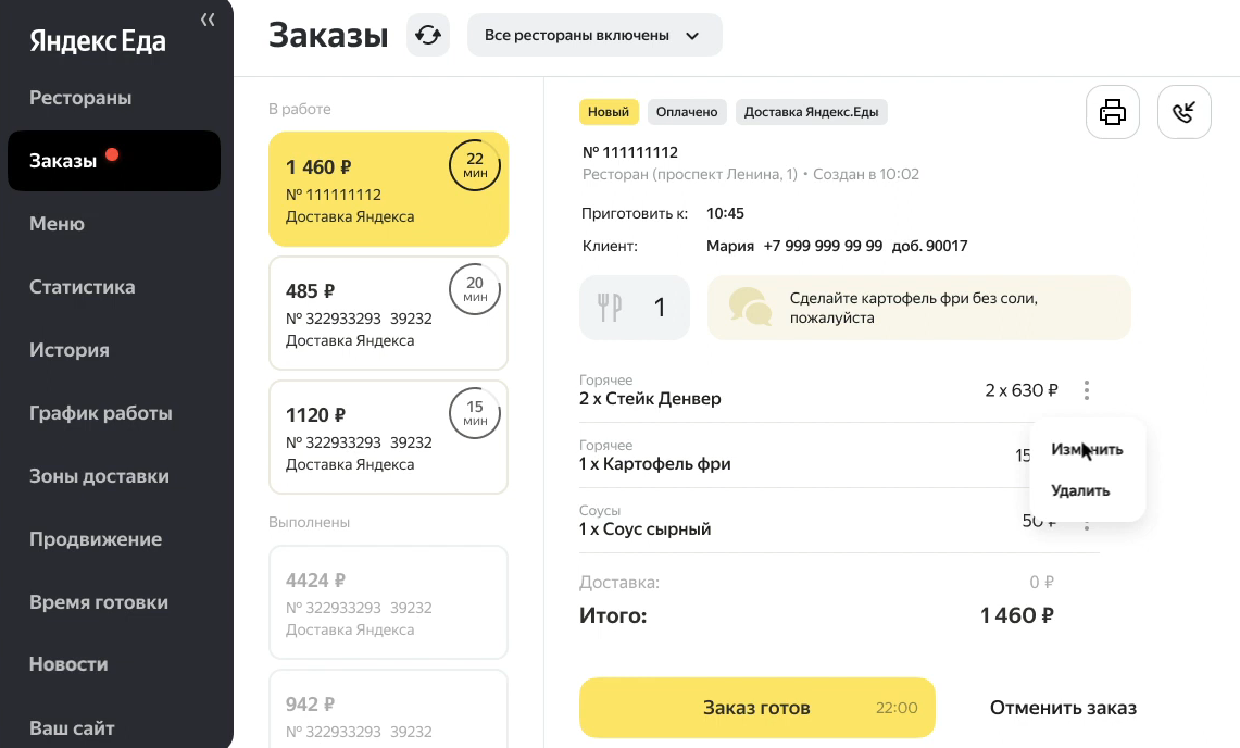 Заказы будут поступать в раздел Заказы. Там же вы сможете принимать заказы и изменять их состав.
