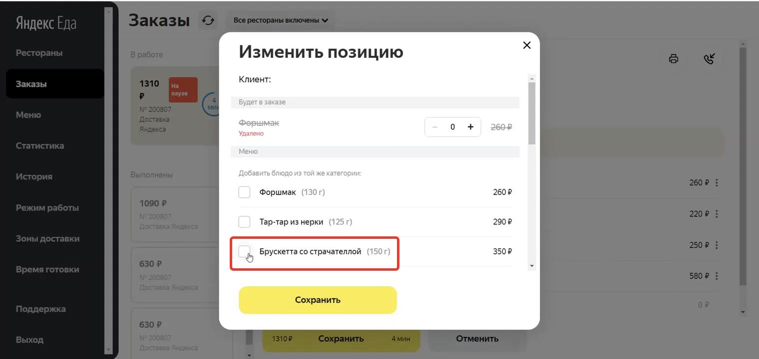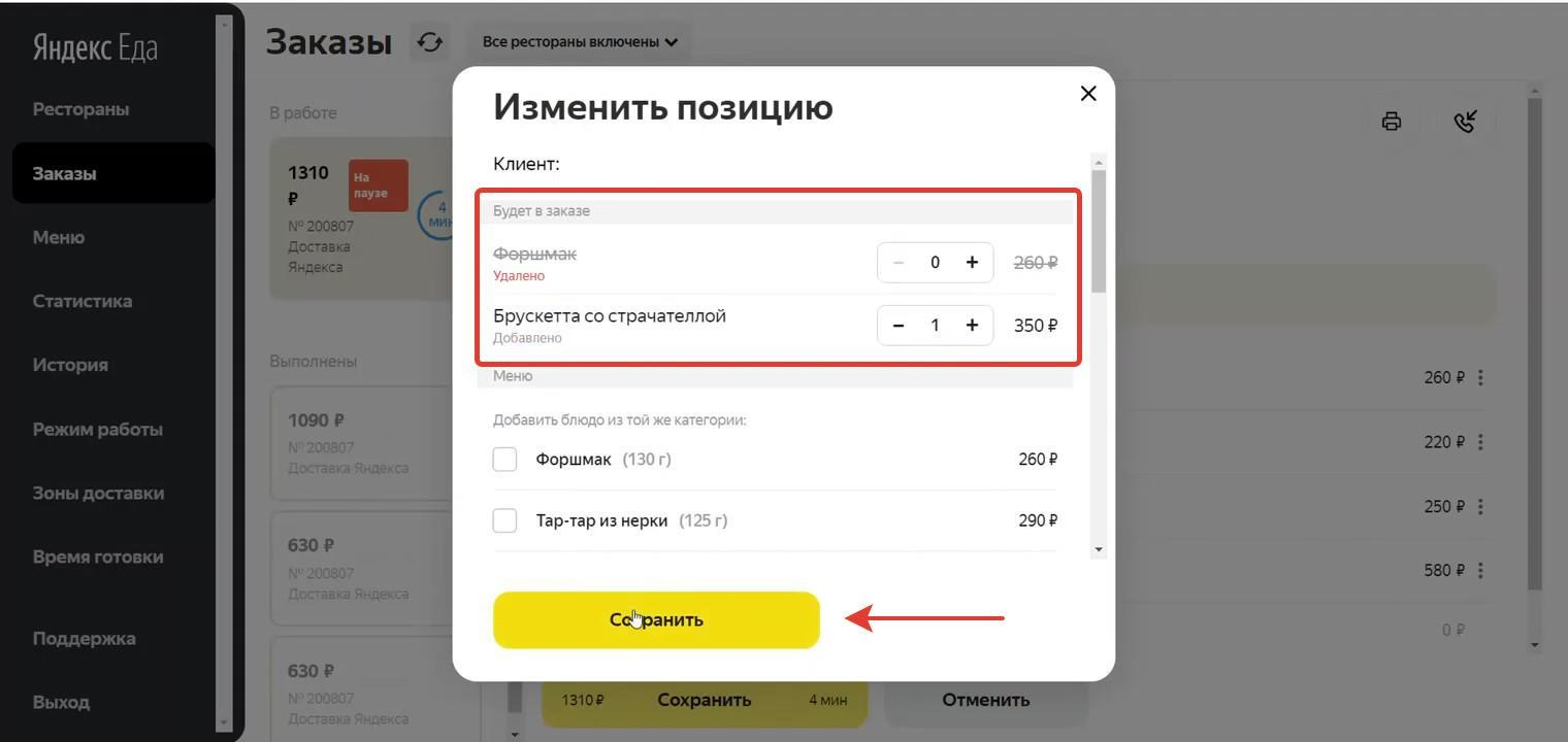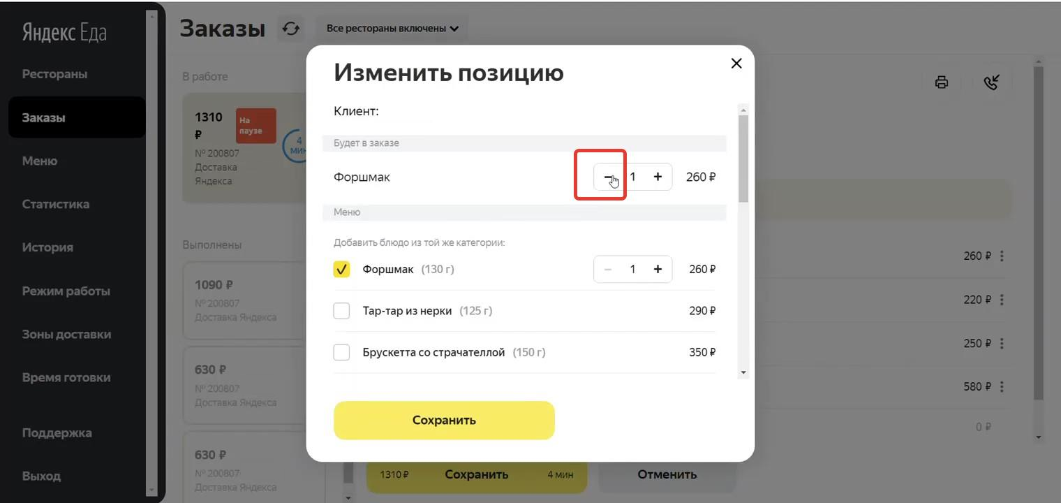Если пользователь согласен заменить блюдо, нажмите на минус возле этой позиции — появится список блюд из вашего меню. Выберите новую позицию, о которой договорились с пользователем.