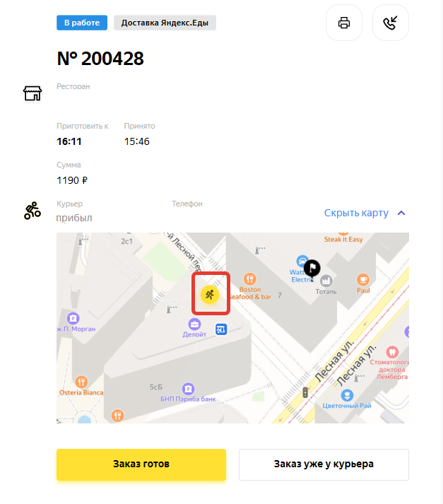 Отследить местоположение курьера по карте можно на листе активного заказа. Карта с передвижением курьера появляется после того, как его назначили на заказ. Обычно это происходит, когда ресторан почти закончил готовить — до этого момента в карточке заказа будет написано Ищем курьера.