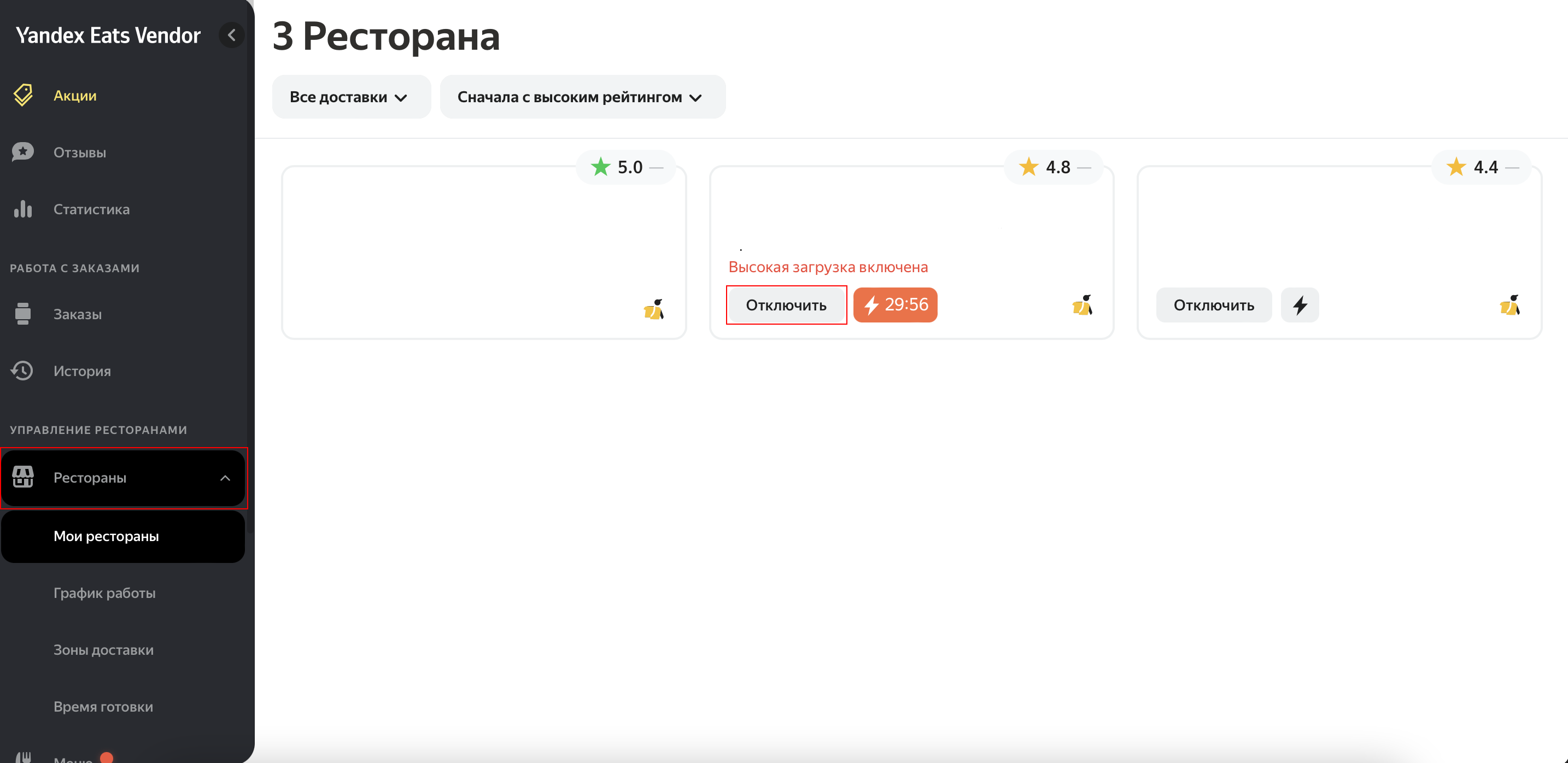 В разделе Мои рестораны выберите нужный ресторан → Отключить