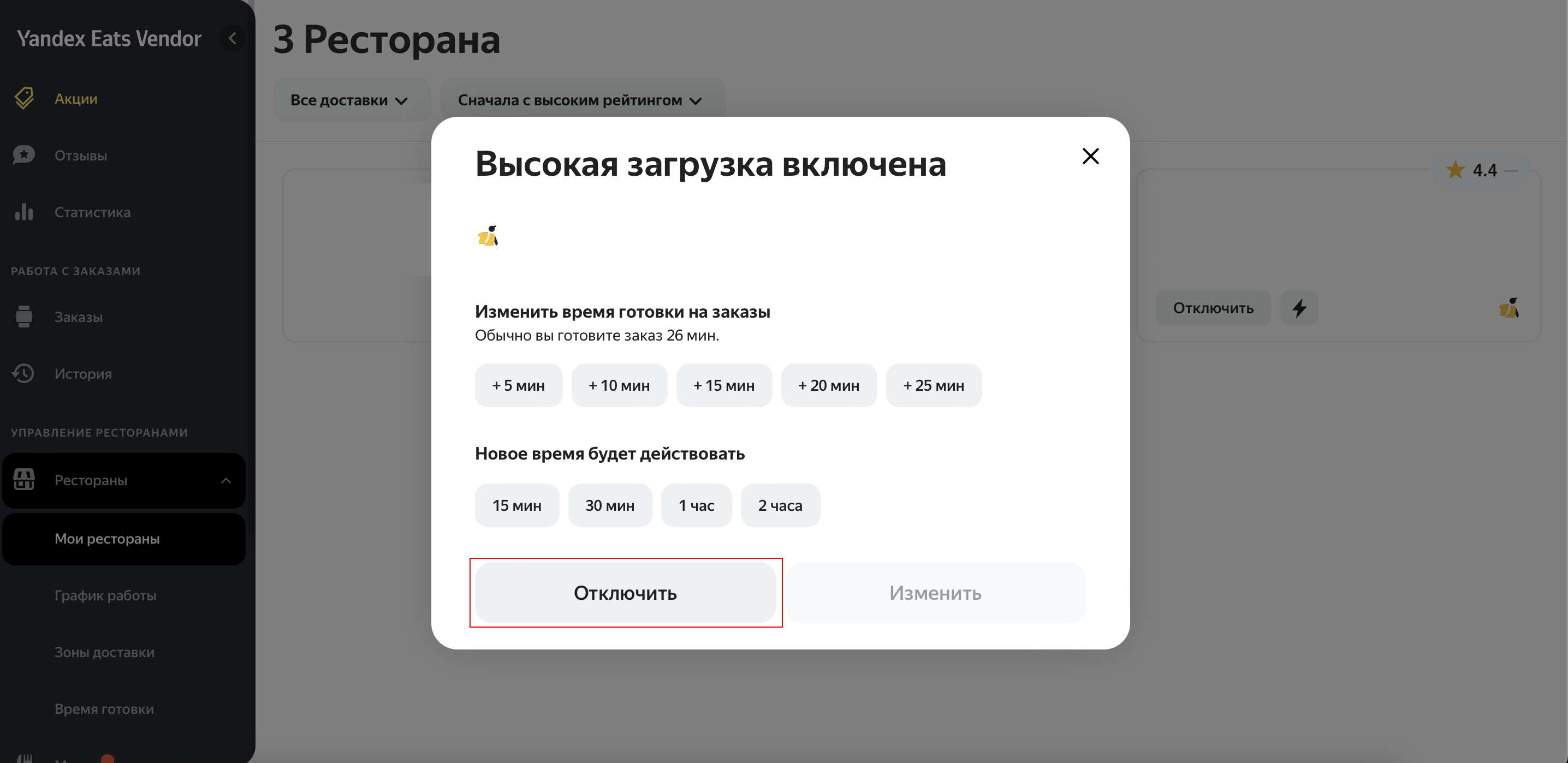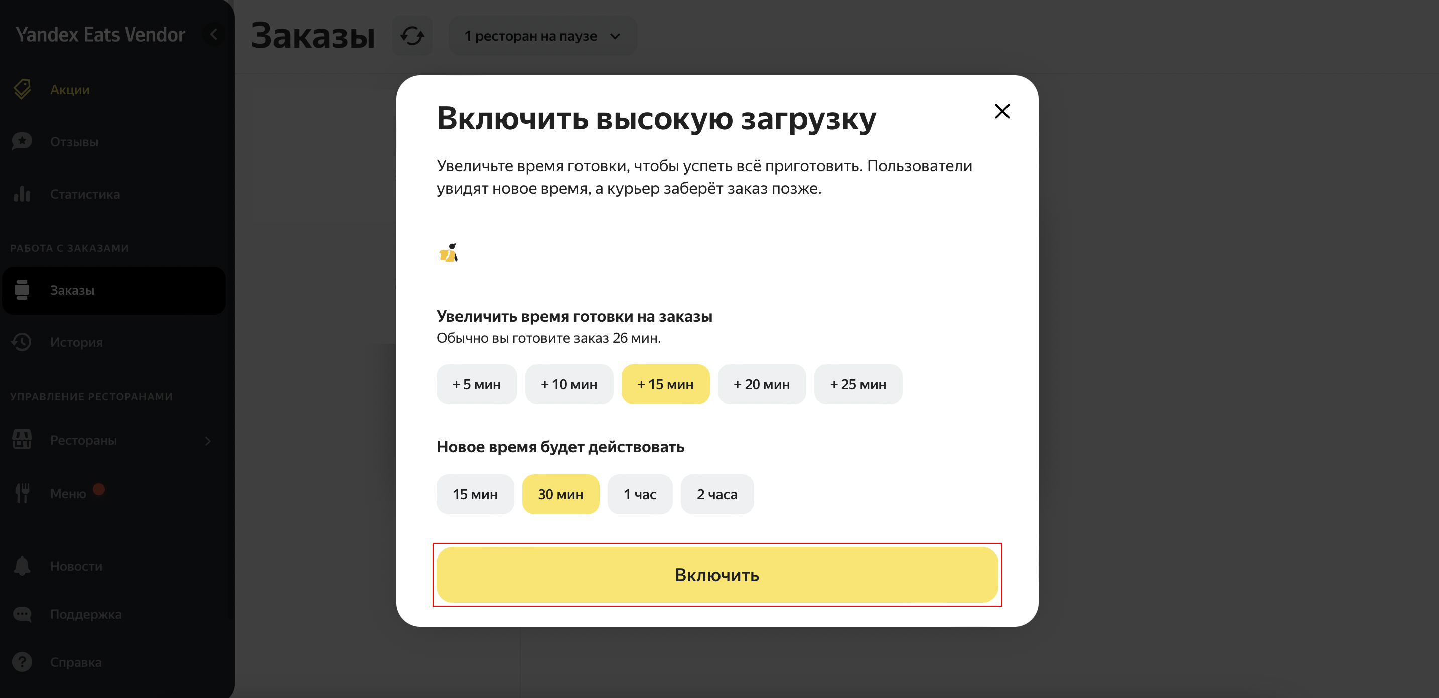 Режим действует только на заказы, принятые во время высокой загрузки. Вы можете продлить его по инструкции выше или вернуться к обычному времени готовки, нажав на иконку молнии → Отключить.