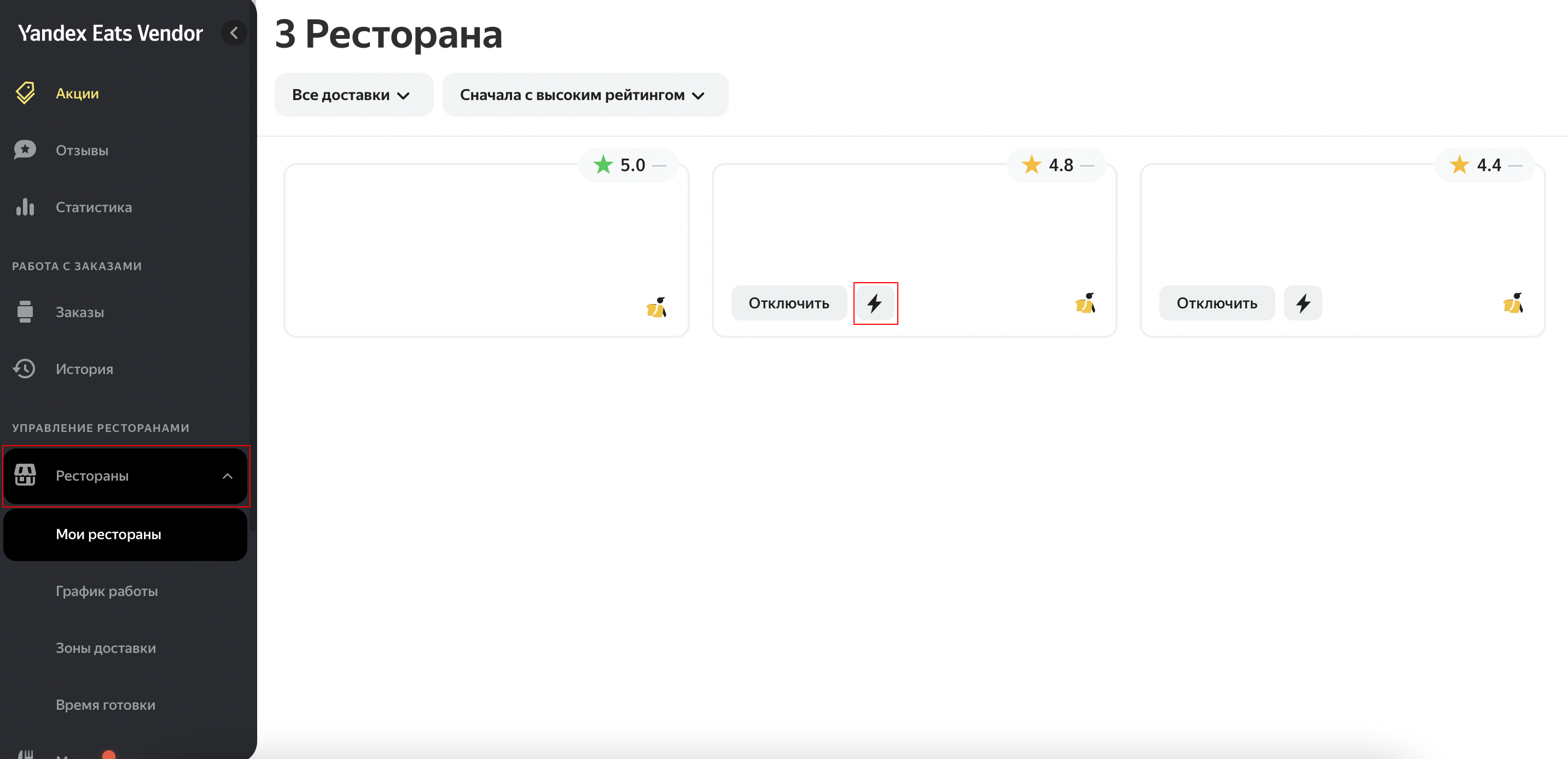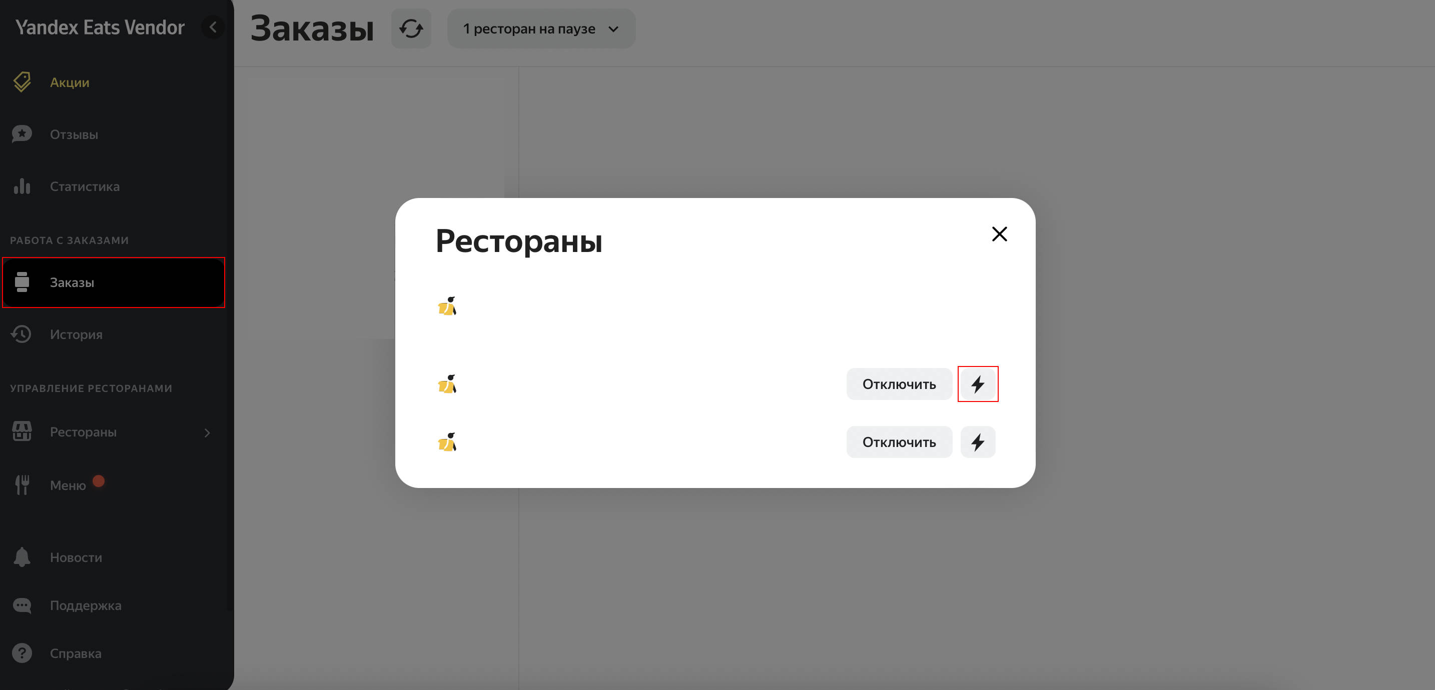 В разделе Мои рестораны выберите нужный ресторан и нажмите на иконку молнии
