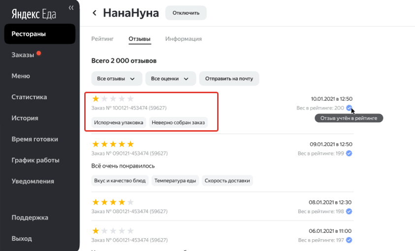 В разделе Отзывы можно увидеть последние 200 оценок, которые пользователи оставили о заказах из вашего ресторана.