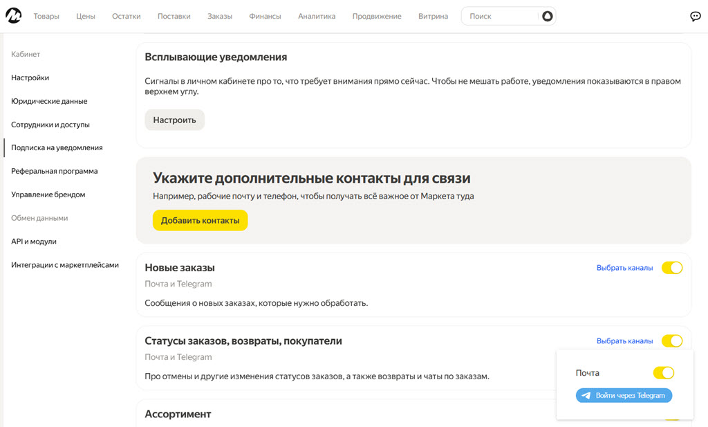 Получайте уведомления из кабинета и другую полезную информацию от Маркета в Telegram и на почту. Вы можете получать уведомления: