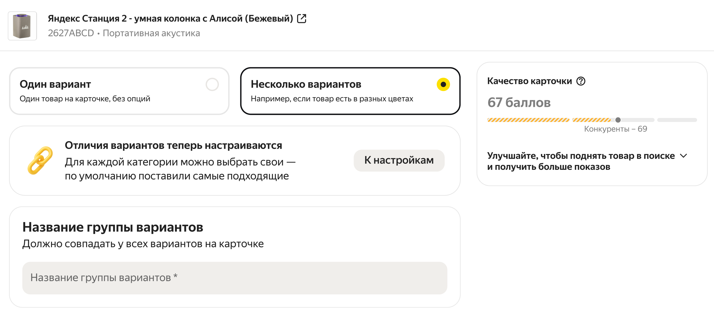 Проверьте, что у товара есть остаток, а в карточке нет других ошибок, не связанных с объединением вариантов. Если есть — исправьте ошибки и попробуйте разместить товар еще раз.