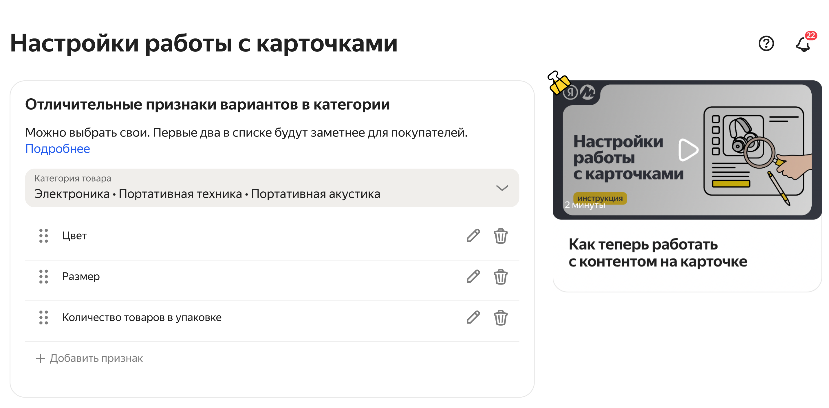 Вы можете самостоятельно выбрать, по каким характеристикам будут отличаться товары. По умолчанию Маркет определяет самые подходящие в категории параметры, а вы можете их отредактировать. Где это можно сделать: