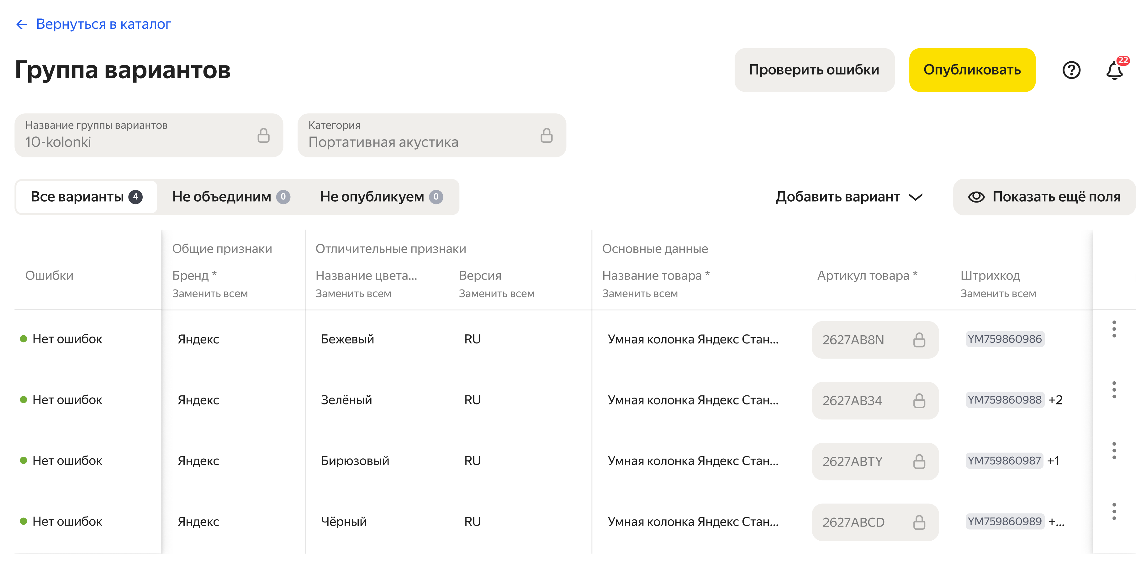 • Проверить ошибки перед публикацией — Маркет подскажет, что нужно исправить. Например, если вы создали два не различающихся между собой варианта или не заполнили обязательные поля (артикул, название и т.д.)