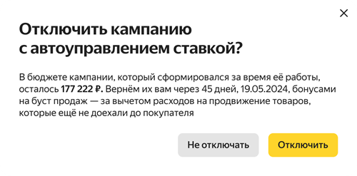 Если у вас есть действующая кампания с долей от цены оборота и вы решили отключить ее или изменить ставку на процент от цены товара — неиспользованный остаток бюджета Маркет вернет бонусами.