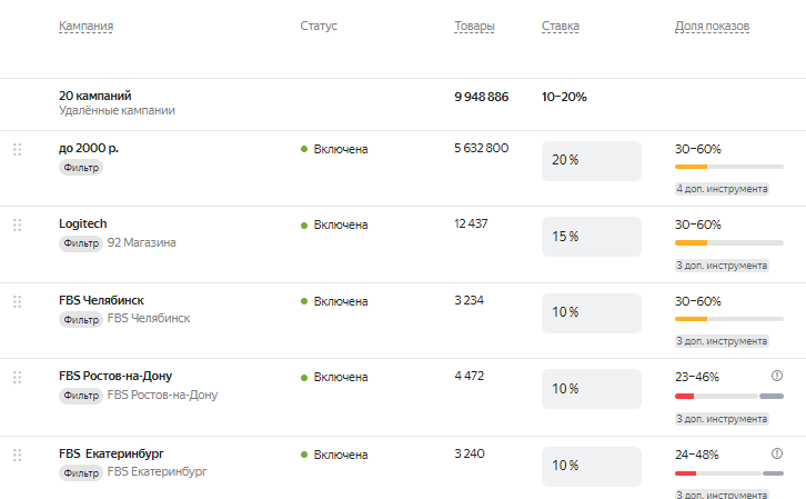 - Изменить приоритеты кампаний, перетаскивая их вверх или вниз. Приоритет важен, если один и тот же товар попадает в несколько кампаний. В такой ситуации для товара работает ставка из той кампании, которая выше всех в списке.