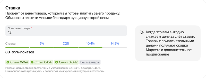 Для продавцов Маркет показывает, какой охват получит ваша кампания при той или иной ставке.