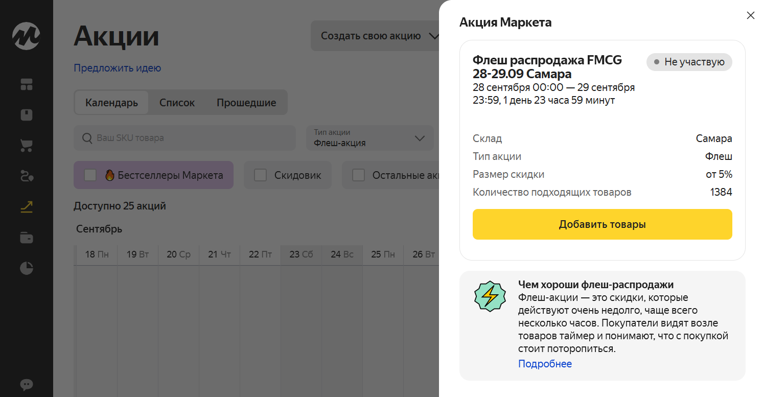 Товар попадет в акцию, но будет продаваться по цене из каталога — Маркет покажет предупреждение, когда вы будете настраивать акцию.